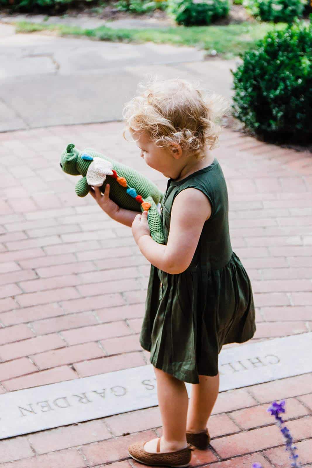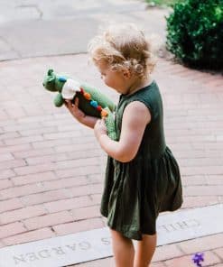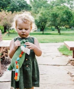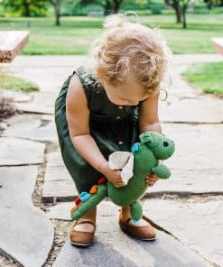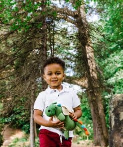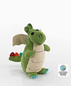 PEBBLE Dragón Verde – Dele alas a la imaginación de su hijo para viajar a tierras lejanas con este dragón verde. Tiene un cuerpo verde con la barriga y alas de color crema y los dedos de los pies de color turquesa. Este muñeco de dragón se completa con suavos picos rojos, naranjas y turquesas en su cola y columna vertebral. Hecho a mano con hilo de algodón, este amigable dragón es suave y gentil, listo para horas de juego imaginativo con su pequeño. Pebble ¡Poniendo sonrisas en las caras de todo el mundo!