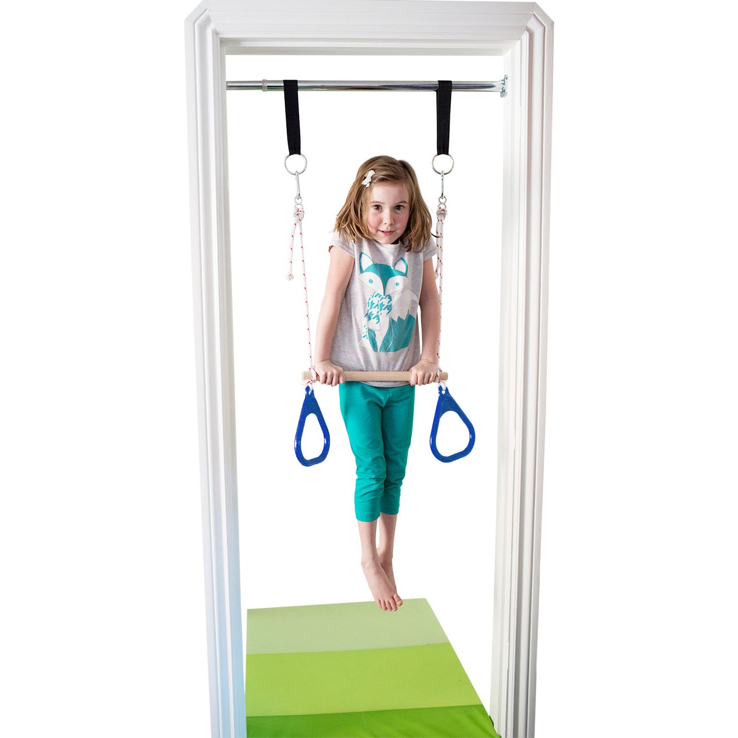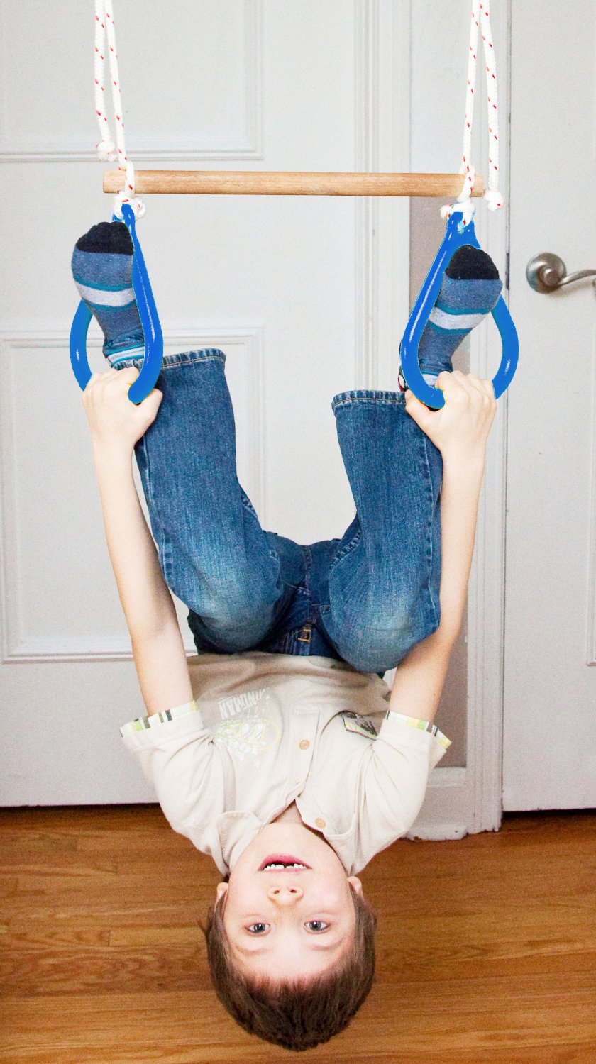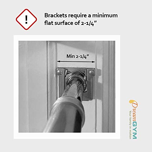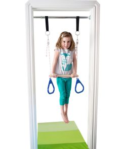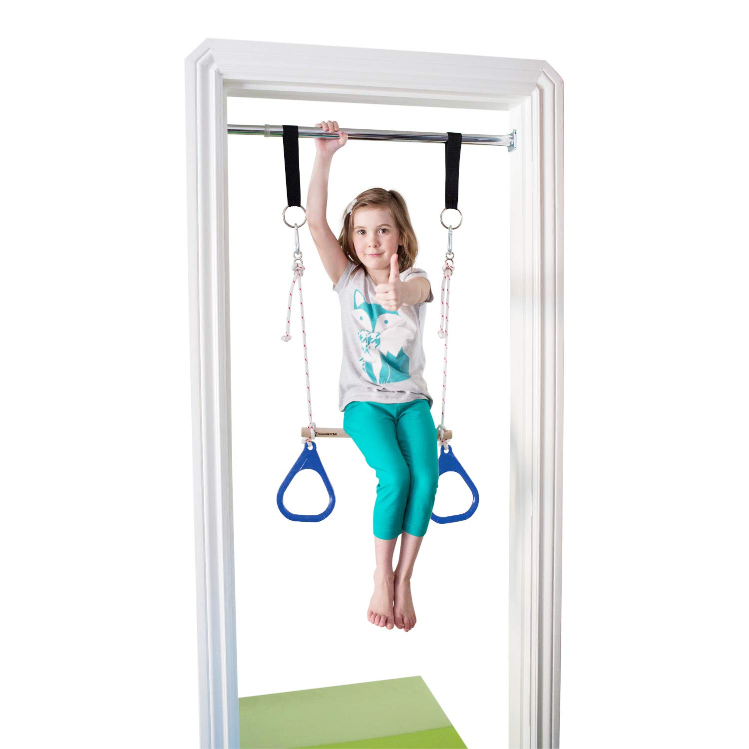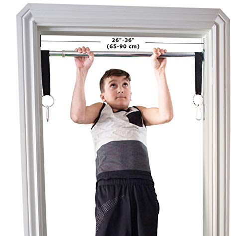 DreamGym columpio de puerta es una gran solución para mantener a los niños activos. La barra cromada se ajusta para adaptarse a la mayoría de los marcos de puertas de 24 pulgadas a 36 pulgadas de ancho. La capacidad de peso para la barra es de 300 libras, permitiendo que adolescentes y adultos jueguen. La capacidad de peso para la barra de trapecio y anillos de gimnasia es de 200 libras. Este kit incluye: Barra de soporte. – Accesorios de montaje, – 2 (Dos) correas para colgar, – clips de resorte 2 (Dos). – Combo de barra de trapecio con anillas de gimnasia. IMPORTANTE: No utilizar un columpio de disco u otro accesorio que gire libremente para evitar golpes en el marco de la puerta.
