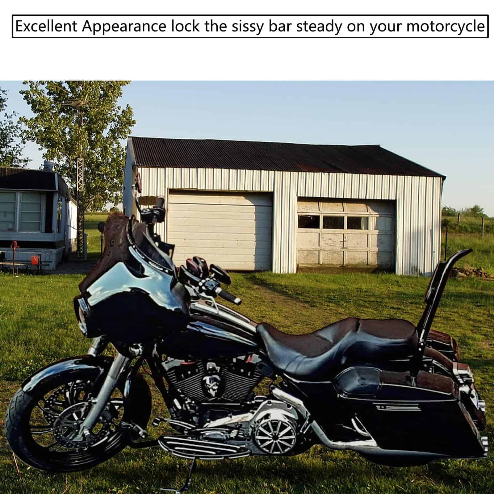 3. FÁCIL INSTALACIÓN Y DESMONTAJE- El respaldo del sissy bar del pasajero es un diseño tipo perno. Se utiliza un bloque de acero pesado de 10 mm de grosor como conector entre el soporte y el tubo de 1.5″. Es irrompible y no tiene marcas de soldadura. Es más seguro y más fuerte que los respaldos soldados. Puedes instalar y desmontar rápida y fácilmente.