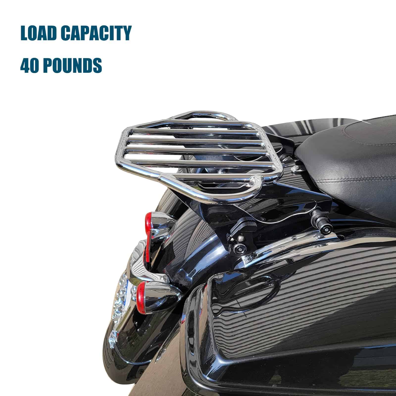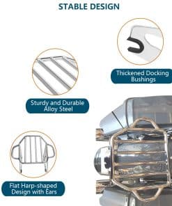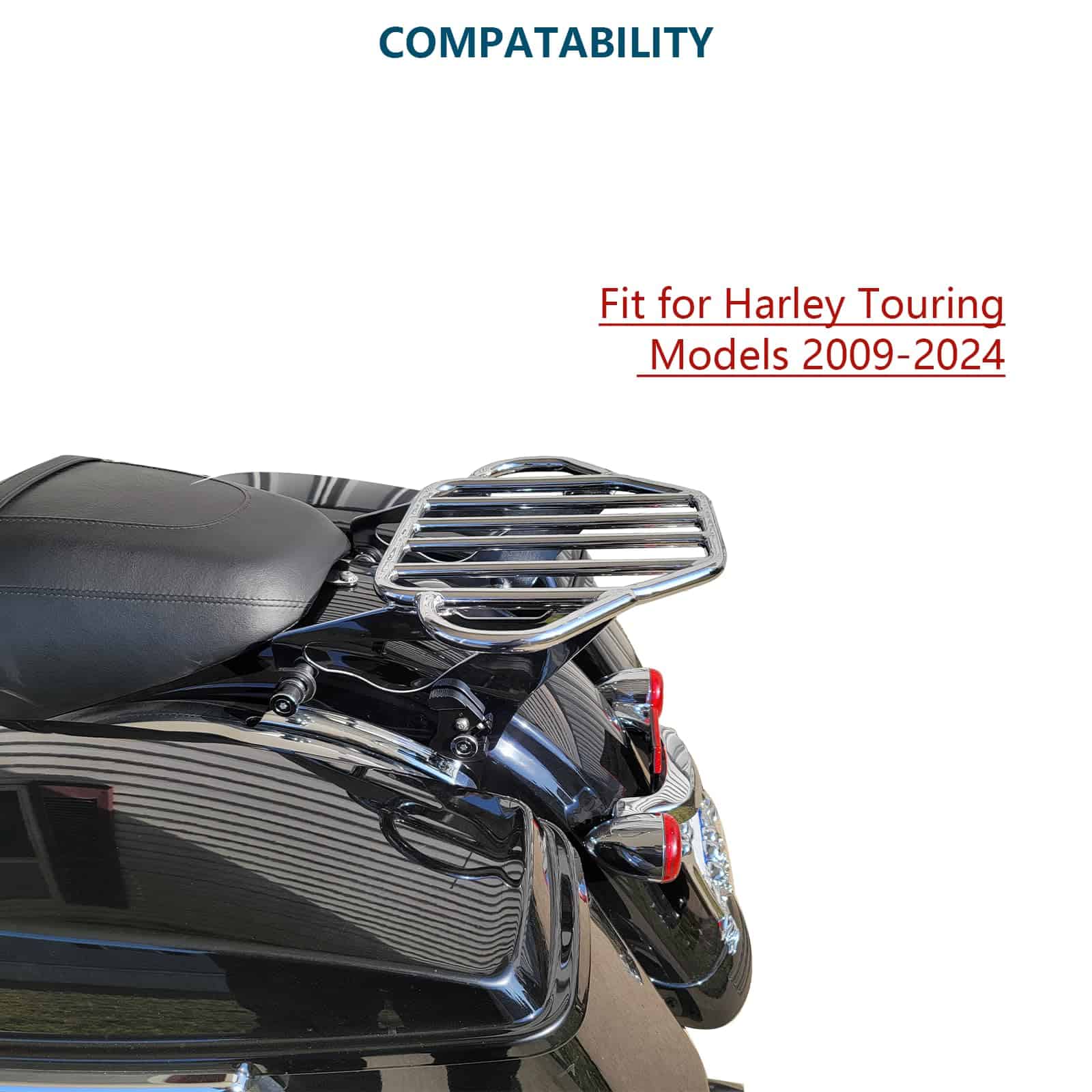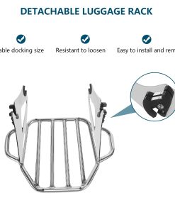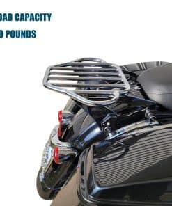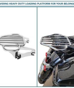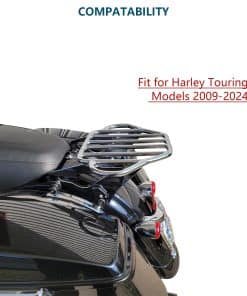 Soporte de equipaje para motocicletas compatible con modelos Harley Davidson Touring 2009-2024 (excepto aquellos equipados con respaldo desmontable premium con inclinación ajustable). Se puede usar en modelos FLHTC, FLHTCU, FLHTK y FLTRU con tour pack de montaje rígido con la compra de un kit de conversión de tour pack desmontable; los modelos FLHX, FLHXS, FLTR y FLTRX requieren la compra por separado de un kit de reubicación de antena o kit de antena oculta. El diseño estable del soporte de equipaje cuenta con una forma plana en forma de arpa con orejas en ambos lados para asegurar y atar la carga a la motocicleta de forma segura. Los manguitos de acoplamiento engrosados en ambos lados evitan que los puntos de interfaz y acoplamiento se deslicen, haciendo que todo el soporte de equipaje sea más estable y evite los ruidos durante la conducción. Hecho de acero sólido de aleación, es fuerte y duradero y puede soportar hasta 40 libras. El acabado premium mejora la resistencia a la corrosión del soporte de equipaje y mantiene un aspecto brillante, asegurando que se adapte a las inclemencias del tiempo y no sea fácil de oxidar, resistiendo así largos viajes en motocicleta. El soporte de equipaje desmontable es compatible con el hardware de montaje de 4 puntos de Harley, su palanca de trinquete está reforzada para múltiples usos para una instalación o liberación rápida y fácil, simplificando el proceso de personalización para los motociclistas que valoran una experiencia libre de problemas. No hay interferencia entre las alforjas y el soporte de equipaje. Incluye: 1 x Soporte de equipaje desmontable con dos clips de cierre. Nuevo 100% de posventa. Nota: Verifique la holgura de los clips de cierre en viajes largos. Requiere la compra por separado de un kit de hardware de montaje de 4 puntos (no incluido en la lista de suministros)