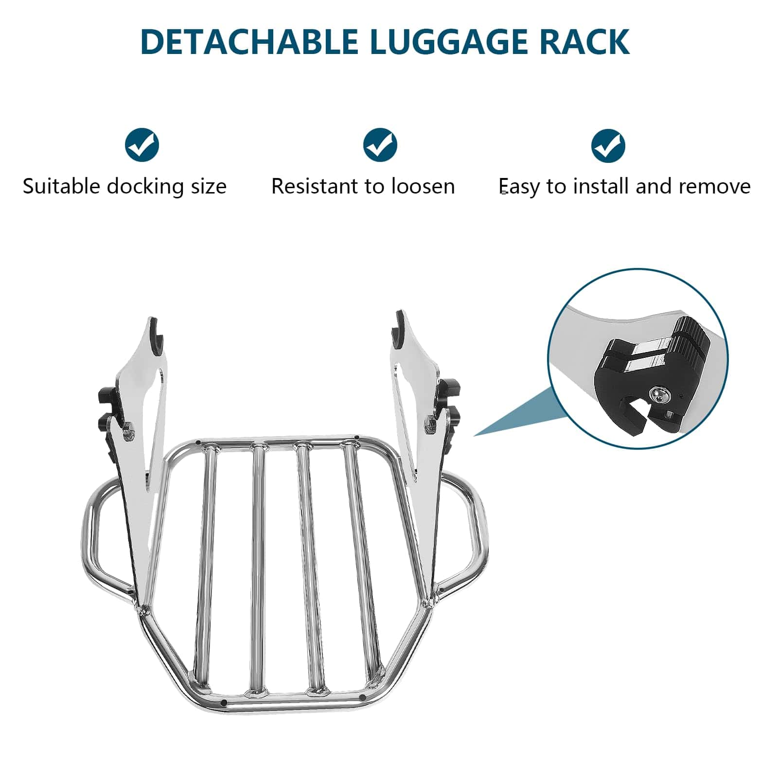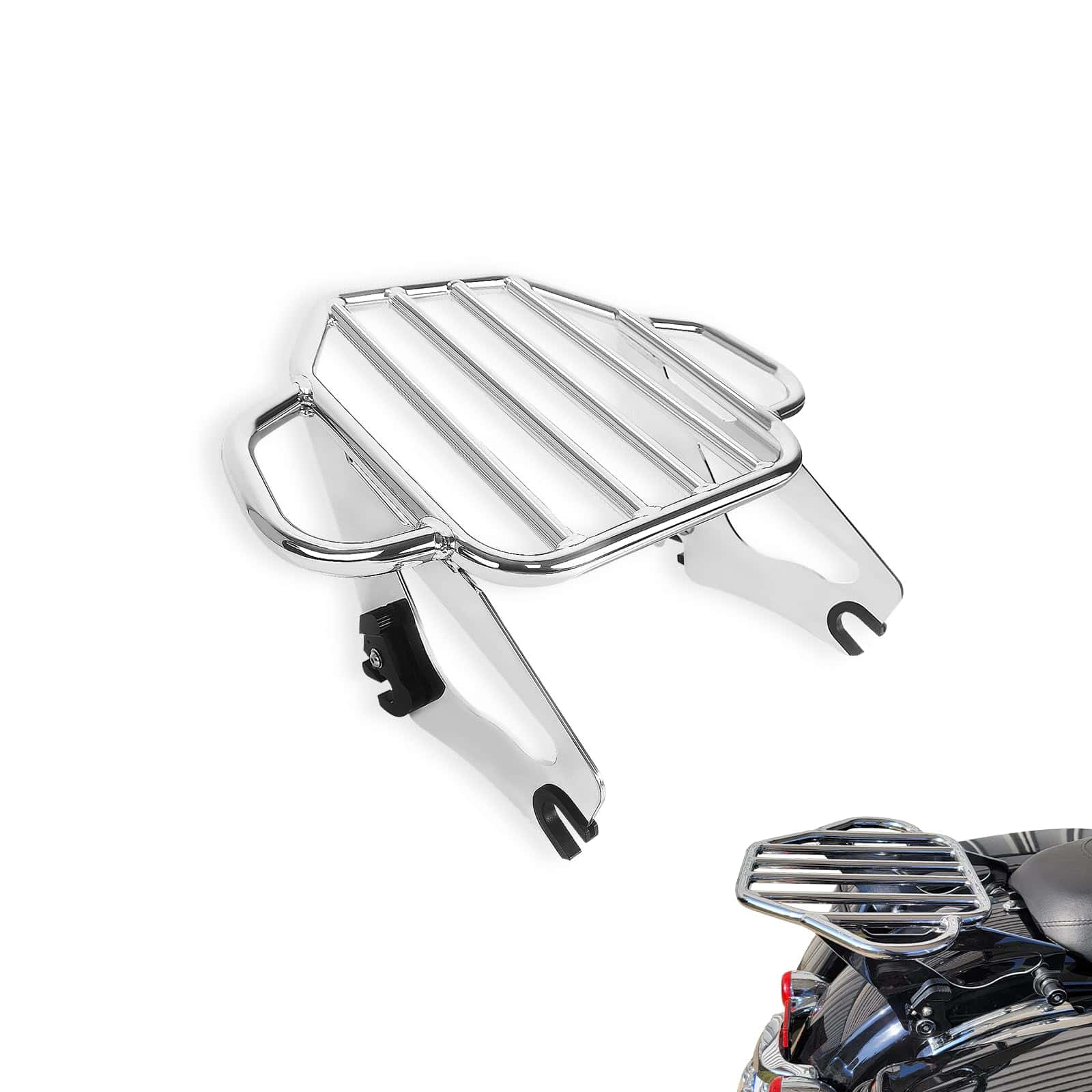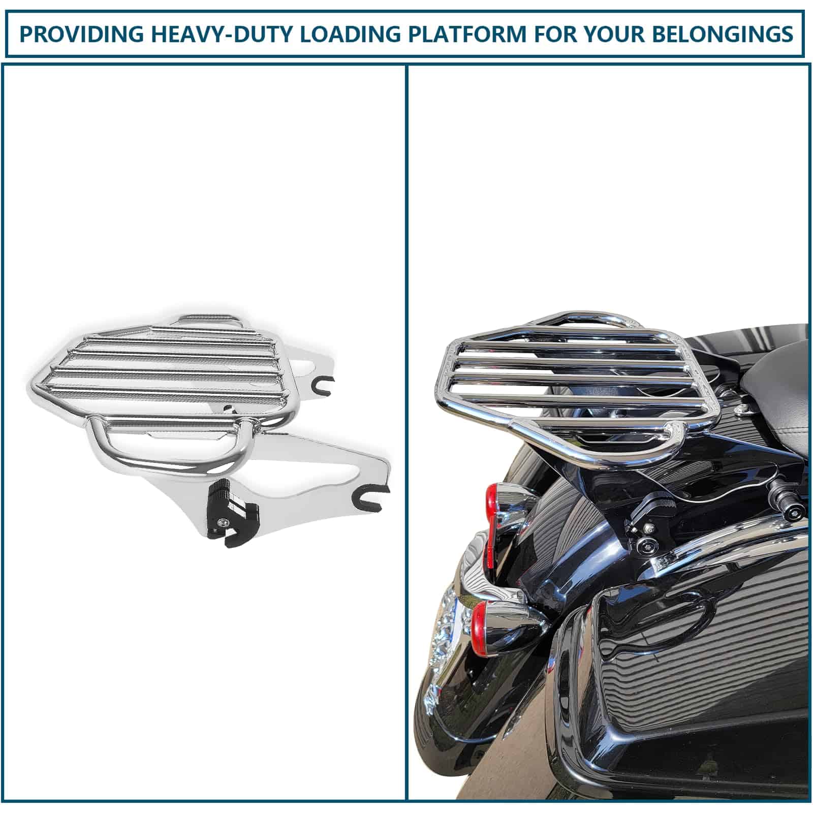 Soporte de equipaje para motocicletas compatible con modelos Harley Davidson Touring 2009-2024 (excepto aquellos equipados con respaldo desmontable premium con inclinación ajustable). Se puede usar en modelos FLHTC, FLHTCU, FLHTK y FLTRU con tour pack de montaje rígido con la compra de un kit de conversión de tour pack desmontable; los modelos FLHX, FLHXS, FLTR y FLTRX requieren la compra por separado de un kit de reubicación de antena o kit de antena oculta. El diseño estable del soporte de equipaje cuenta con una forma plana en forma de arpa con orejas en ambos lados para asegurar y atar la carga a la motocicleta de forma segura. Los manguitos de acoplamiento engrosados en ambos lados evitan que los puntos de interfaz y acoplamiento se deslicen, haciendo que todo el soporte de equipaje sea más estable y evite los ruidos durante la conducción. Hecho de acero sólido de aleación, es fuerte y duradero y puede soportar hasta 40 libras. El acabado premium mejora la resistencia a la corrosión del soporte de equipaje y mantiene un aspecto brillante, asegurando que se adapte a las inclemencias del tiempo y no sea fácil de oxidar, resistiendo así largos viajes en motocicleta. El soporte de equipaje desmontable es compatible con el hardware de montaje de 4 puntos de Harley, su palanca de trinquete está reforzada para múltiples usos para una instalación o liberación rápida y fácil, simplificando el proceso de personalización para los motociclistas que valoran una experiencia libre de problemas. No hay interferencia entre las alforjas y el soporte de equipaje. Incluye: 1 x Soporte de equipaje desmontable con dos clips de cierre. Nuevo 100% de posventa. Nota: Verifique la holgura de los clips de cierre en viajes largos. Requiere la compra por separado de un kit de hardware de montaje de 4 puntos (no incluido en la lista de suministros)