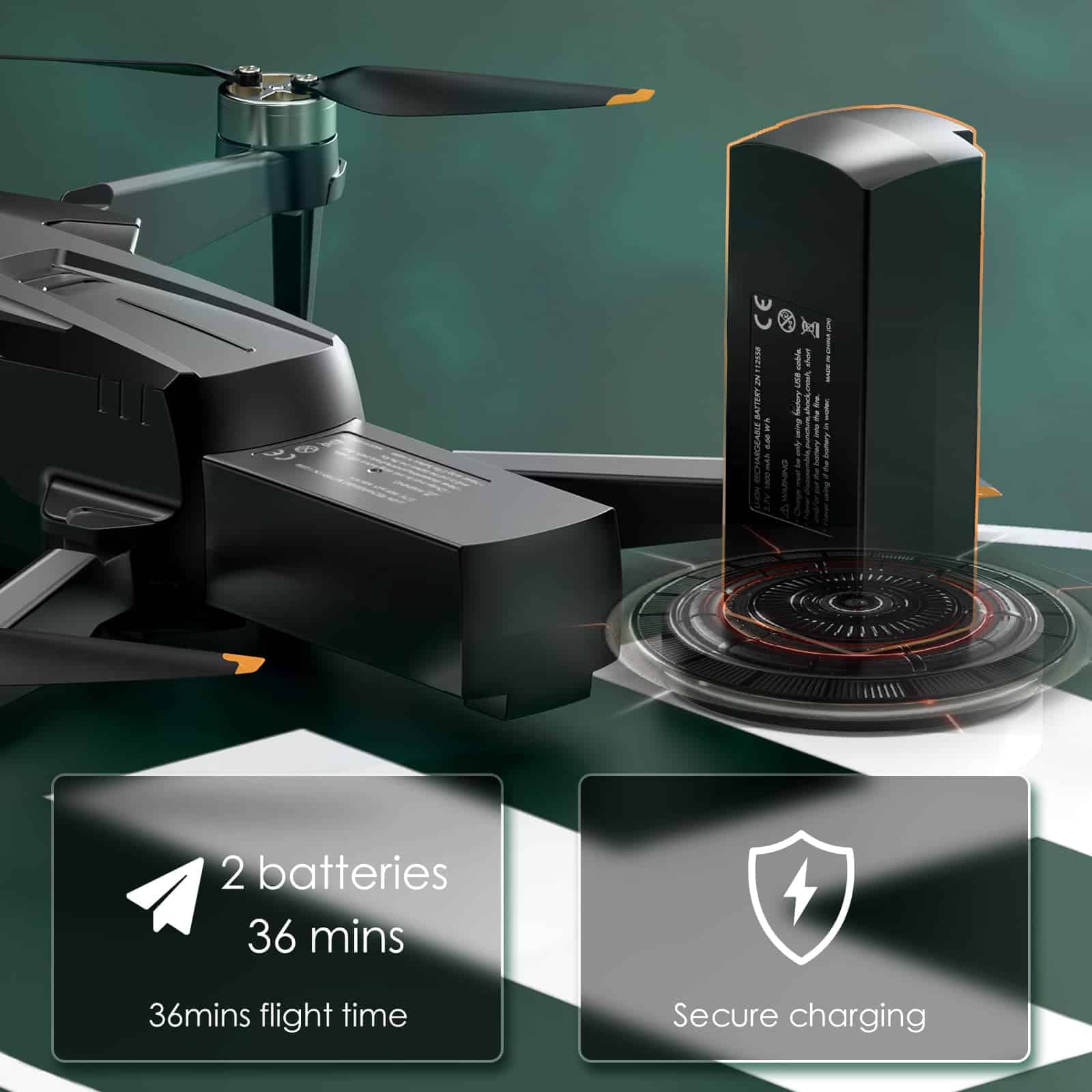 1. Motores Brushless Fuertes y Baterías Mejoradas: Los resistentes motores brushless de aleación ofrecen mayor resistencia al viento, brindando un vuelo más rápido, silencioso y potente. Equipado con 2 baterías mejoradas, puede proporcionar hasta 36 minutos de tiempo de vuelo, permitiendo que su dron viaje libremente en el cielo.