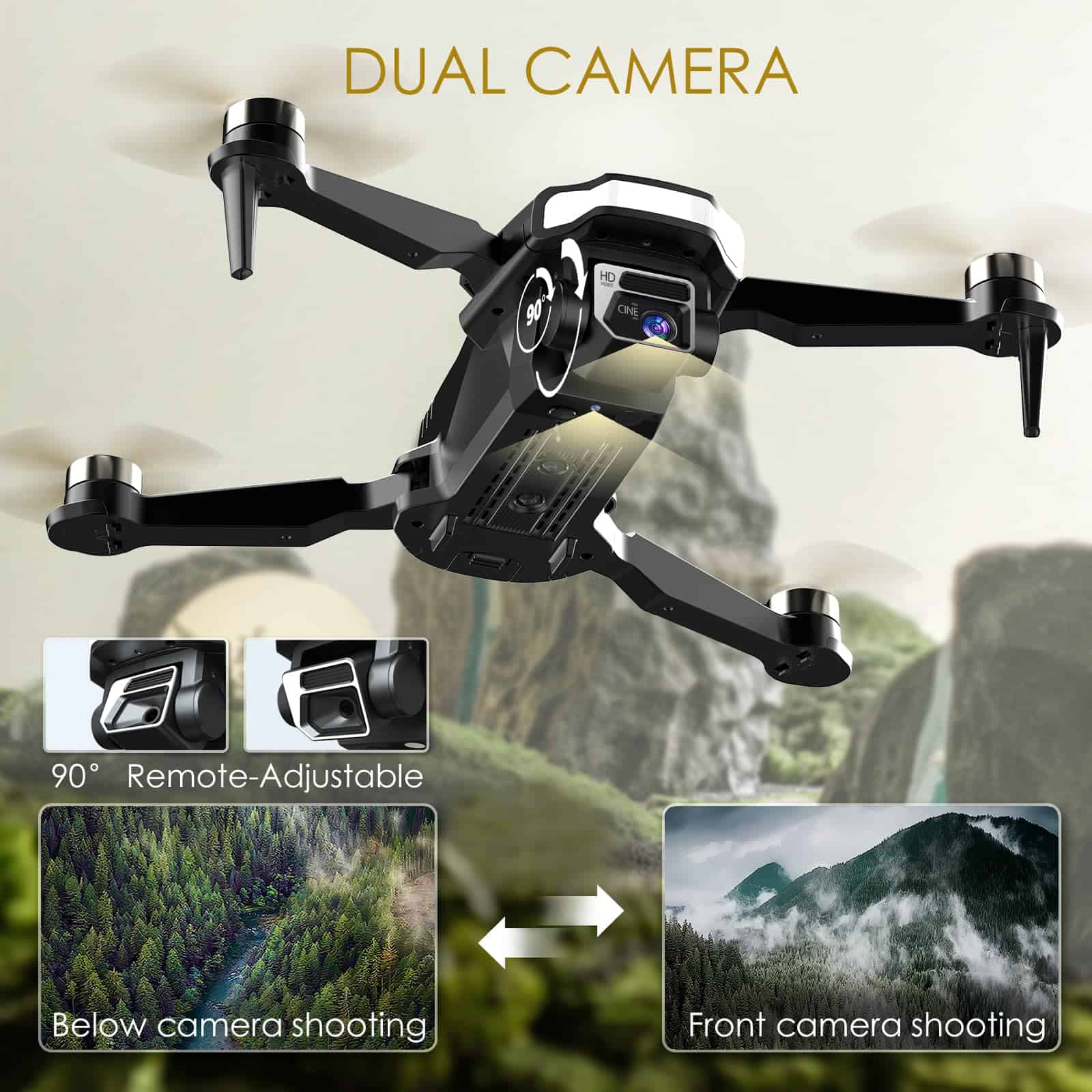 4. Cámara Ajustable HD 2K: Equipado con una cámara HD 2K que puede ajustarse dentro de 90 grados con su control remoto o la aplicación, las cámaras duales pueden brindarle una emocionante experiencia de paisajes aéreos, y ayudarlo a capturar cada momento maravilloso desde una perspectiva de pájaro.