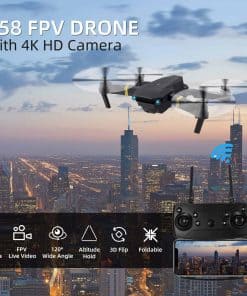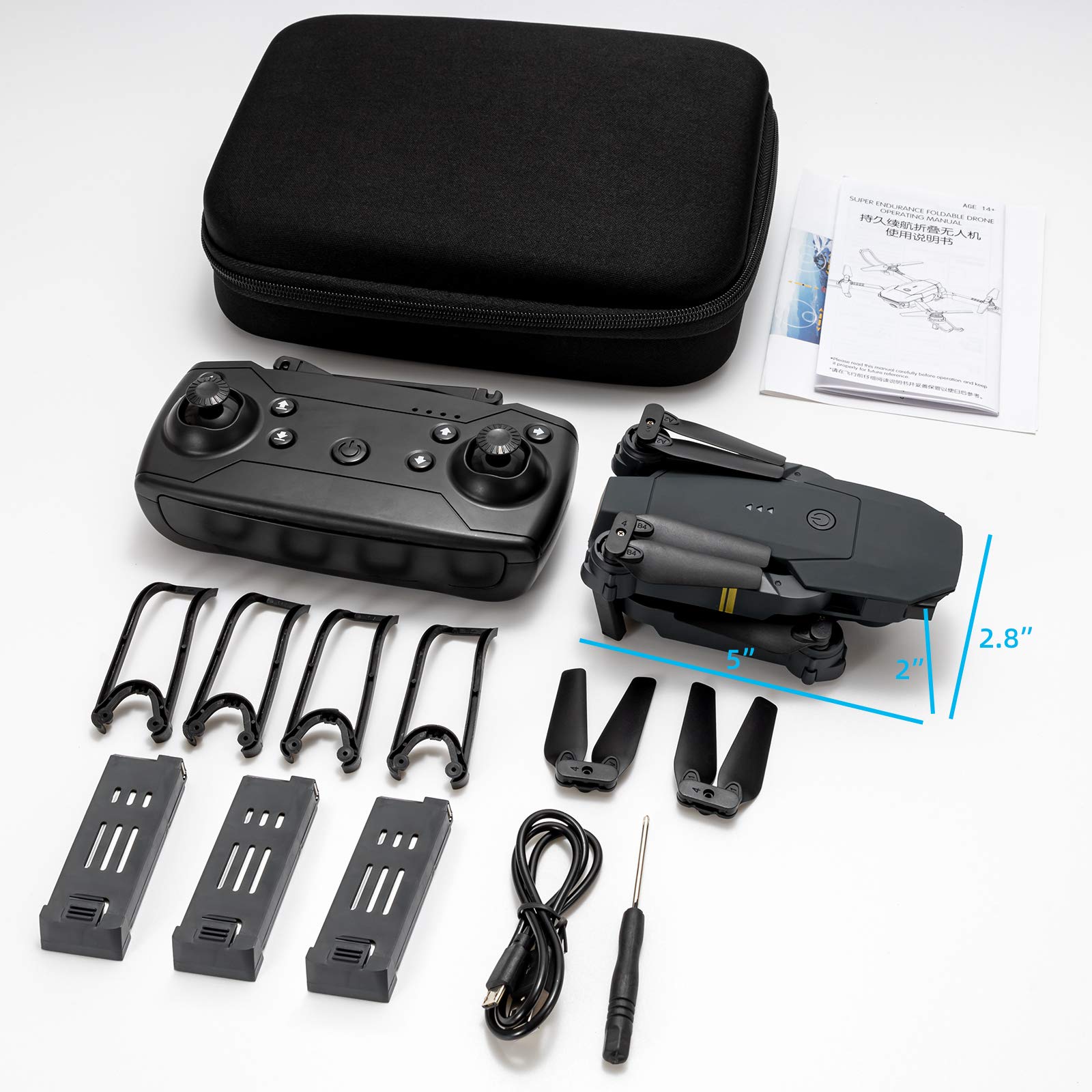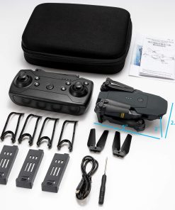 Drones con cámara para adultos y niños 4K Quadcopter plegable E58 Drone con cámara HD 1080P Negro. 1. Drone con cámara HD 1080P toma fotos y videos HD, disfruta de la función FPV. El dron E58 está equipado con una cámara HD 1080P de 120 grados de ángulo ancho, que captura video de alta calidad y fotos aéreas claras. El sistema FPV de transmisión en tiempo real Wi-Fi puede conectarse a tu teléfono con el dron y la vista se mostrará directamente en tu teléfono, así que disfruta del mundo sobre el horizonte, captura fotos con precisión y graba videos para momentos extraordinarios. 2. Dron multifunción volteo 3D y retorno automático en una tecla y modo sin cabeza y retención de altitud. El dron E58 incluye nuevos efectos especiales de volteo en 3D y ¡puede sorprenderte! La función de retorno en una tecla permite que el dron regrese automáticamente sin perderlo. La opción de modo sin cabeza puede hacer que el frente del dron sea igual que el control remoto, facilitando así volar a tu destino. 3. Portátil y Seguro Puede llevarse alrededor y Brazo de Dron reemplazable. La pequeña estructura contiene un rendimiento excelente y un diseño plegable ingenioso, que te permite viajar ligero y disfrutar de la diversión del vuelo. El brazo del dron es reemplazable, cuando el motor o el brazo del dron está roto, no tienes que preocuparte de que el dron no funcione más. Simplemente reemplaza el brazo del dron y puede volar de nuevo. 4. Fácil de Volar Dron En el modo de retención de altitud, puedes bloquear con precisión la altura y la ubicación, mantenerse estable y capturar video o fotos desde cualquier ángulo de disparo, haciendo que la experiencia sea muy fácil y conveniente, incluso un novato, puede jugar fácilmente con este dron. El dron despega y aterriza automáticamente con un clic, lo cual es muy práctico. El dron también es muy adecuado para principiantes. 5. Larga Duración de Vuelo y Mejor Juguete de Dron para Niños/Adultos 3 baterías pueden soportar un vuelo de 30 minutos, lo que facilita reemplazar la batería y cargarla de forma segura. El dron E58 es un regalo ideal para niños y amantes de los drones.