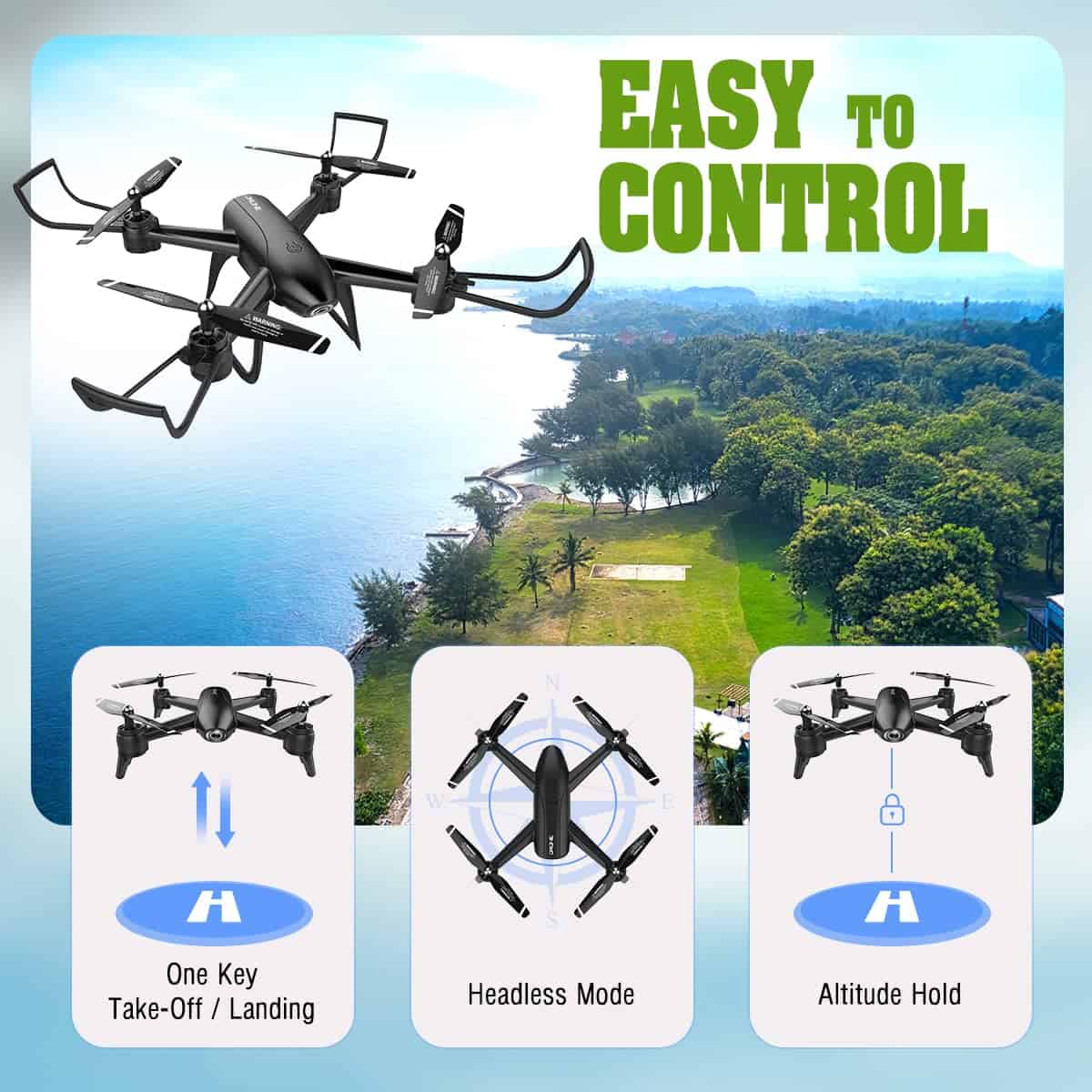 Este dron también es fácil de controlar, con características como despegue y aterrizaje de un solo botón, y modo sin cabeza para movimiento sin problemas en cualquier dirección. Además, tiene una función de visión nocturna que te permite volar y capturar imágenes impresionantes incluso en condiciones de poca luz.