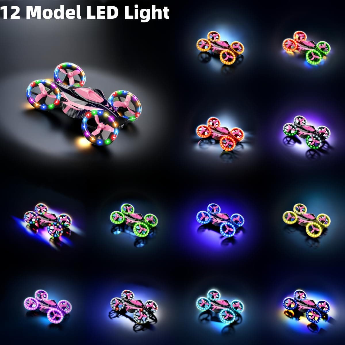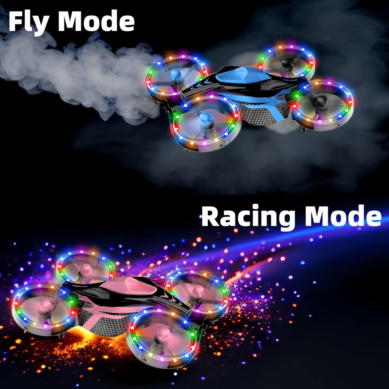2. Diseño único 2 en 1 Modo — Se combina el mini dron con un coche de juguete. Todos quieren experimentar la diversión. ¡Vamos a correr en la carretera! ¡Vamos a volar en el cielo! ¡Puedes disfrutar de la diversión de un coche de carreras (Nota: solo en suelos lisos) y transformarte instantáneamente en un dron volador en cualquier momento! Fácil de controlar la función de despegue/aterrizaje deslizante único. ¡Un solo dispositivo, doble entretenimiento!