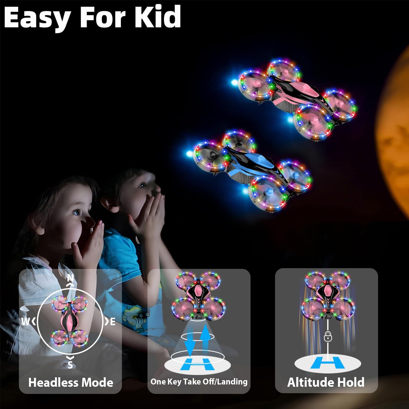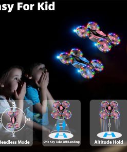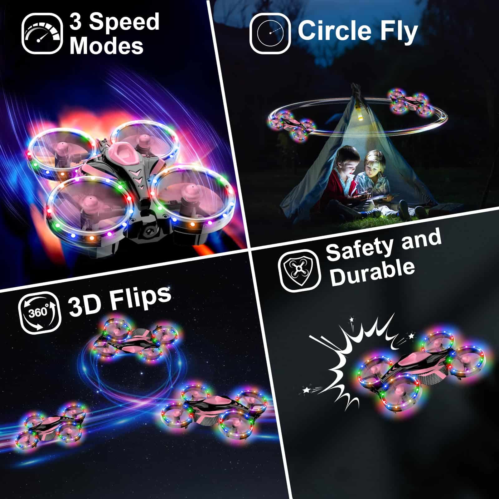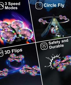 1. Luces LED coloridas y modos múltiples — Las 4 protecciones de las hélices del mini dron están cubiertas con luces LED cambiantes de color ultrabrillantes y ajustables, 11 colores y modos son libres de elegir. Lo que atrae a los niños no solo es el vuelo agradable, sino también las luces llamativas, el diseño de múltiples luces LED coloridas garantiza operar con LED de colores neón ultrabrillantes, tanto de día como de noche, en interiores o exteriores, seguramente pueden crear una atmósfera increíble.