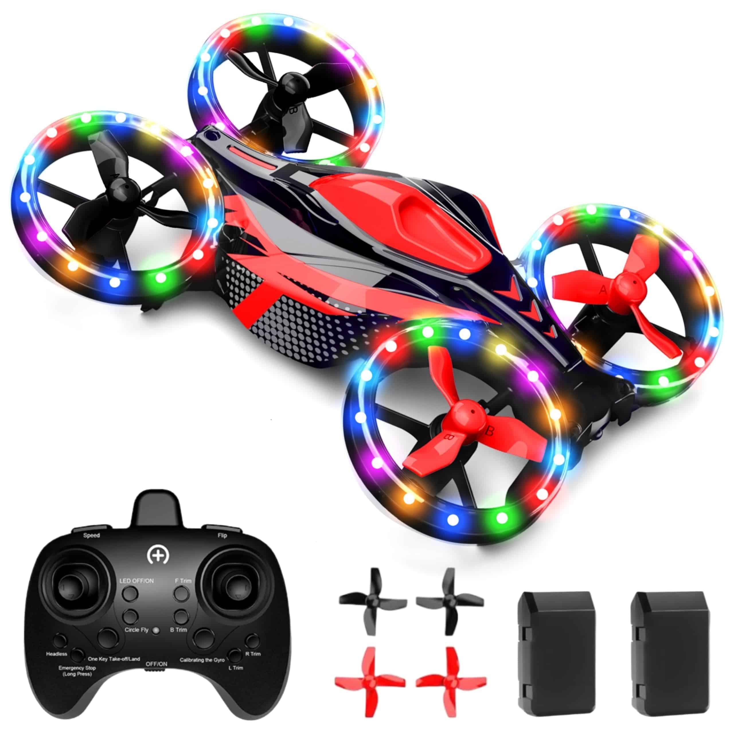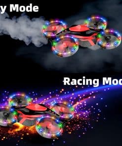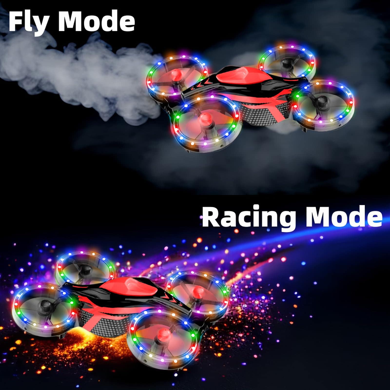 2. Diseño Único de Modo 2 en 1 – Combina el mini dron con un coche de juguete. Todos quieren experimentar la diversión. ¡Corramos en la carretera! ¡Volamos por el cielo! ¡Puedes disfrutar de la diversión de un auto de carreras (Nota: solo en terreno liso) y transformarte instantáneamente en un dron volador en cualquier momento! Fácil de controlar la función de despegue/aterrizaje de planeo único. ¡Una máquina, doble entretenimiento!