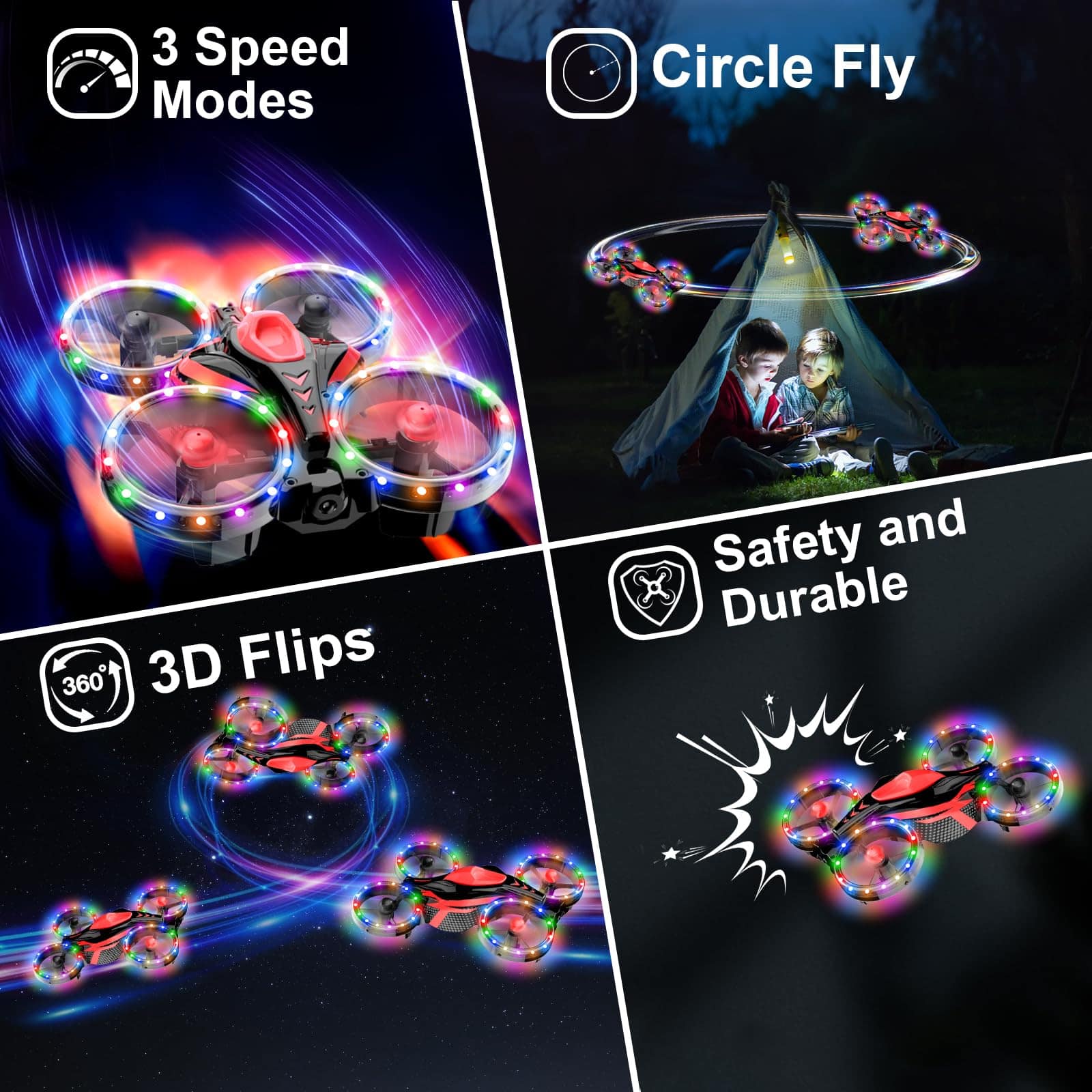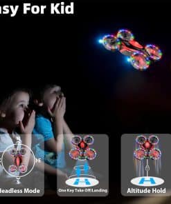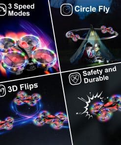 1. Múltiples Colores y Modos de Luz LED Coloridos – Las 4 protectores de hélice del mini dron están cubiertos con luces LED cambiantes de color ultra brillantes, 11 colores y modos son libres de elegir. Lo que atrae a los niños no es solo el vuelo divertido, sino también las luces llamativas, el diseño de múltiples luces LED coloridas garantiza un funcionamiento con LED neon ultra brillantes sin importar el día o la noche, en interiores o exteriores, puede crear seguramente un ambiente increíble.
