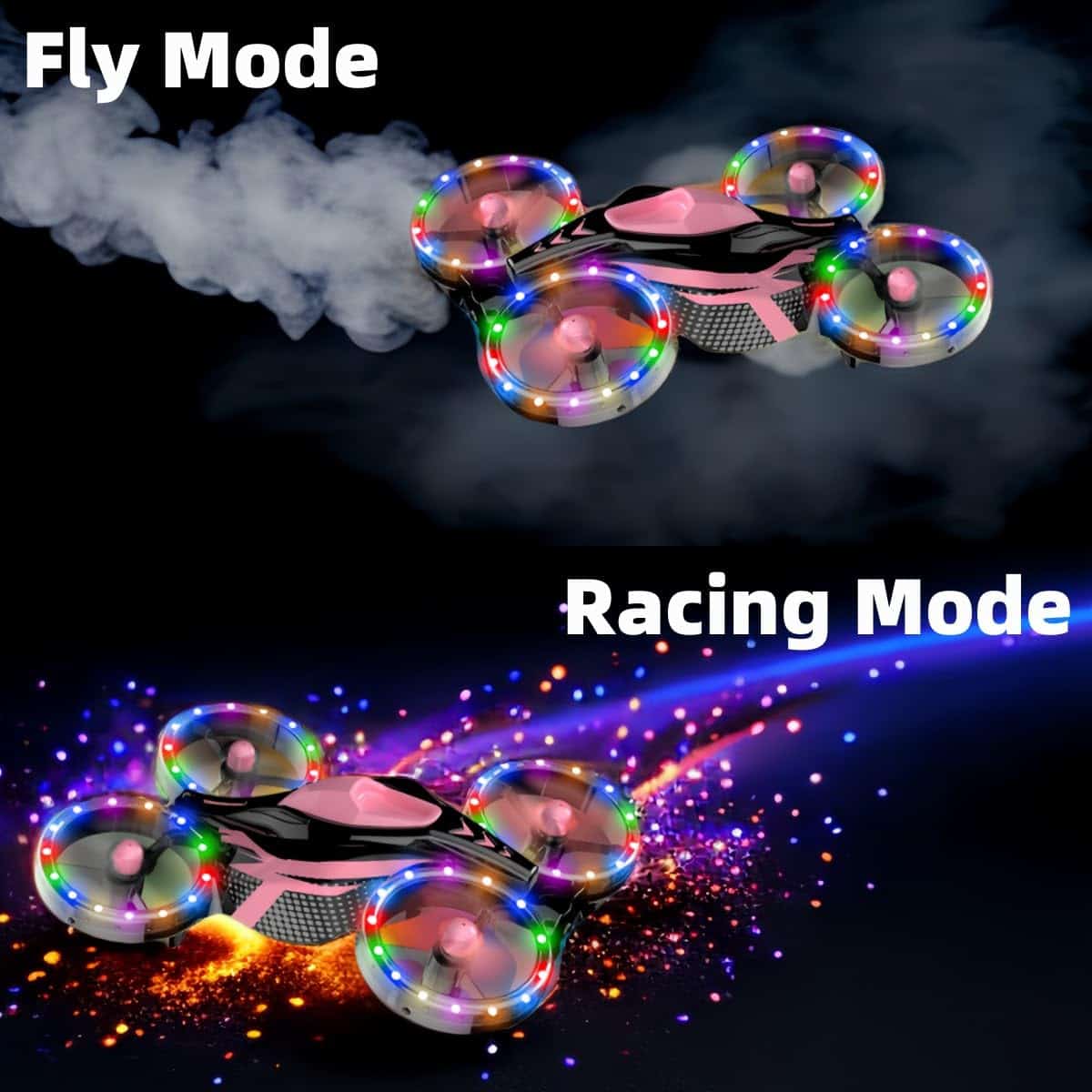 2. Diseño único 2 en 1 – Es un mini dron combinado con un coche de juguete. Todos quieren experimentar la diversión. Vamos a competir en la carretera. Vamos a volar en el cielo. ¡Puedes disfrutar de la diversión de competir en coche (Nota: solo en suelo liso) y transformarte instantáneamente en un dron volador en cualquier momento que desees! Fácil de controlar la función de despegue/aterrizaje deslizante único. ¡Una máquina, doble entretenimiento!