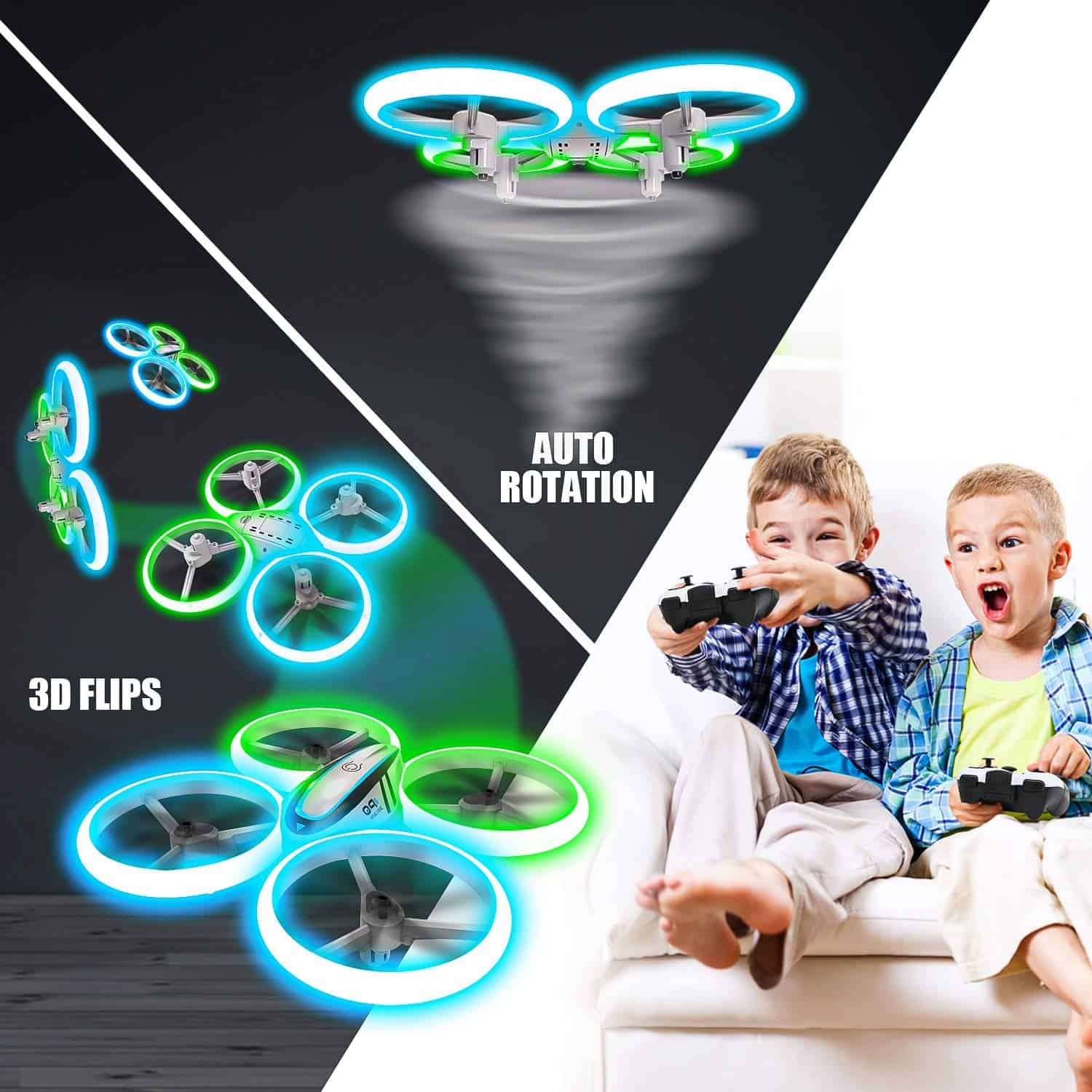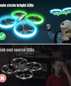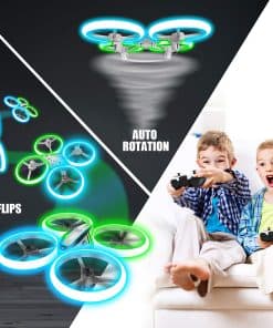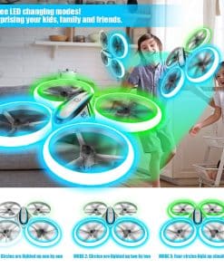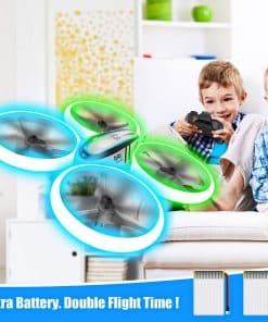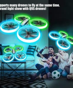1. ILUMINA EL CIELO: Brillantes LEDs en el drone Q9s emiten luz vibrante en neon verde y azul por todo su marco, brindándote un poderoso efecto iluminador y una experiencia de vuelo vívida. También cuenta con tres modos de visualización diferentes para la iluminación. ¡Creemos que les sorprenderá a todos! 2. SEGURO Y DURADERO: El estilo estructurado y las cuatro resistentes protecciones de hélice aseguran un vuelo seguro que protege a tus niños para evitar lesiones corporales por las hélices giratorias. Material ABS de alta calidad para resistir innumerables choques o caídas. Drone muy duradero y confiable para Niños y Principiantes. 3. FÁCIL DE USAR: 1: Puedes despegar / aterrizar el drone con un solo botón. 2: Tres velocidades para que elijas, no importa si eres principiante o jugador experimentado. 3: No tienes que preocuparte por identificar direcciones bajo el modo headless. 4: La característica de retención de altitud permite a tu drone mantenerse en el aire automáticamente. (¡Incluso si no haces nada con el controlador!) Todas estas características hacen que el drone sea extremadamente amigable para principiantes. 4. Doble Tiempo de Vuelo: Viene con 2 baterías. El jugador tendrá más tiempo para divertirse. 5. Múltiples Trucos de Vuelo: Con giros de 360 grados y funciones de auto-rotación para enriquecer tu experiencia de vuelo. Buen juguete para niños.