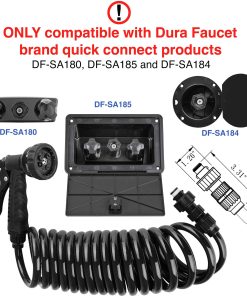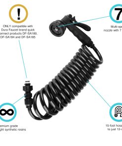 Este modelo está construido con resinas sintéticas de alta calidad y peso ligero para una durabilidad sin igual y una vida útil prolongada. Se instala rápidamente y es compatible solo con los grifos Dura Faucet DF-SA180, DF-SA184 y DF-SA185. La ducha exterior se extiende hasta 15 pies y se retrae a 13 pulgadas compactas. Certificado UPC, CUPC y libre de plomo. Resistente a la decoloración y la corrosión.