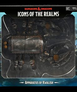 La figura en caja de Dungeons & Dragons D&D Icons of the Realms: Apparatus of Kwalish es una nueva figura basada en el memorable aparato mágico de Kwalish del mundo de D&D. Esta enorme figura de 75 mm puede contener hasta dos criaturas de tamaño mediano o pequeño, al igual que el objeto mágico en la descripción del juego a continuación. Este artículo parece ser un gran barril de hierro sellado que pesa 500 libras. El barril tiene un mecanismo oculto que, al ser liberado, desbloquea una escotilla en un extremo del barril, permitiendo que dos criaturas de tamaño mediano o más pequeñas se metan dentro. Diez palancas están colocadas en una fila en el extremo del barril, cada una en posición neutral, capaces de moverse hacia arriba o hacia abajo. Cuando se utilizan ciertas palancas, el aparato se transforma para parecerse a una langosta gigante.