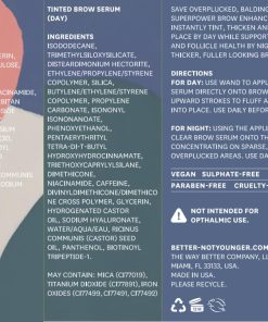 Rico en vitamina B, péptidos y aminoácidos, nuestro potente dúo para realzar las cejas con suero de día y noche es el primero de su tipo y funciona de dos maneras; el tratamiento nocturno claro de rápida absorción nutre y acondiciona la piel y los folículos de las cejas para un crecimiento más completo y saludable de las cejas. El 93% de las mujeres probadas dijeron que el suero con color del día hacía que sus cejas lucieran instantáneamente más completas, domadas y bajo control en un estudio independiente de consumidores. Ingredientes: Suero de DíaPigmentos minerales, Hialuronato de Sodio, Complejo de Vitamina B. Suero de NocheBiotinoyl Tripeptida-, Aceite de Ricino, Niacinamida. Modo de uso: Tratamiento de DíaSuero Tintado para Cejas: Usando el cepillo de cerdas de doble longitud, aplique el suero directamente sobre los pelos de las cejas en golpes cortos y ascendentes para dar volumen, estilo y dar forma a las cejas mientras se rellenan los espacios. Usar diariamente antes del maquillaje. Tratamiento de NocheSuero para Cejas: Usando el aplicador de felpa, aplique suavemente el suero claro en el área de las cejas concentrándose en las áreas dispersas, adelgazadas y sobredepiladas. Úselo diariamente antes de acostarse. En Better Not Younger estamos en una misión para cambiar la industria, por eso todos nuestros productos son libre de parabenos, libre de sulfatos o SLS, y libre de crueldad.