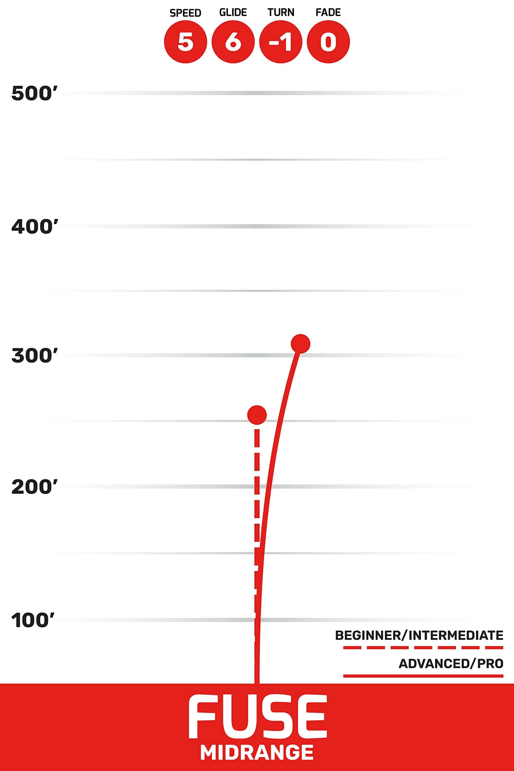 4. CALIFICACIONES DE VUELO – Las calificaciones de vuelo del disco de golf Fuse son: Velocidad: 5 | Planeo: 6 | Giro: -1 | Desvanecimiento: 0. El Fuse es un disco diseñado para jugadores con sensibilidad. Cuando te enfrentes a espacios complicados y calles estrechas, alcanza el Fuse ya que su gran control y precisión te guiarán por la calle y te permitirán golpear sin esfuerzo pequeños espacios.