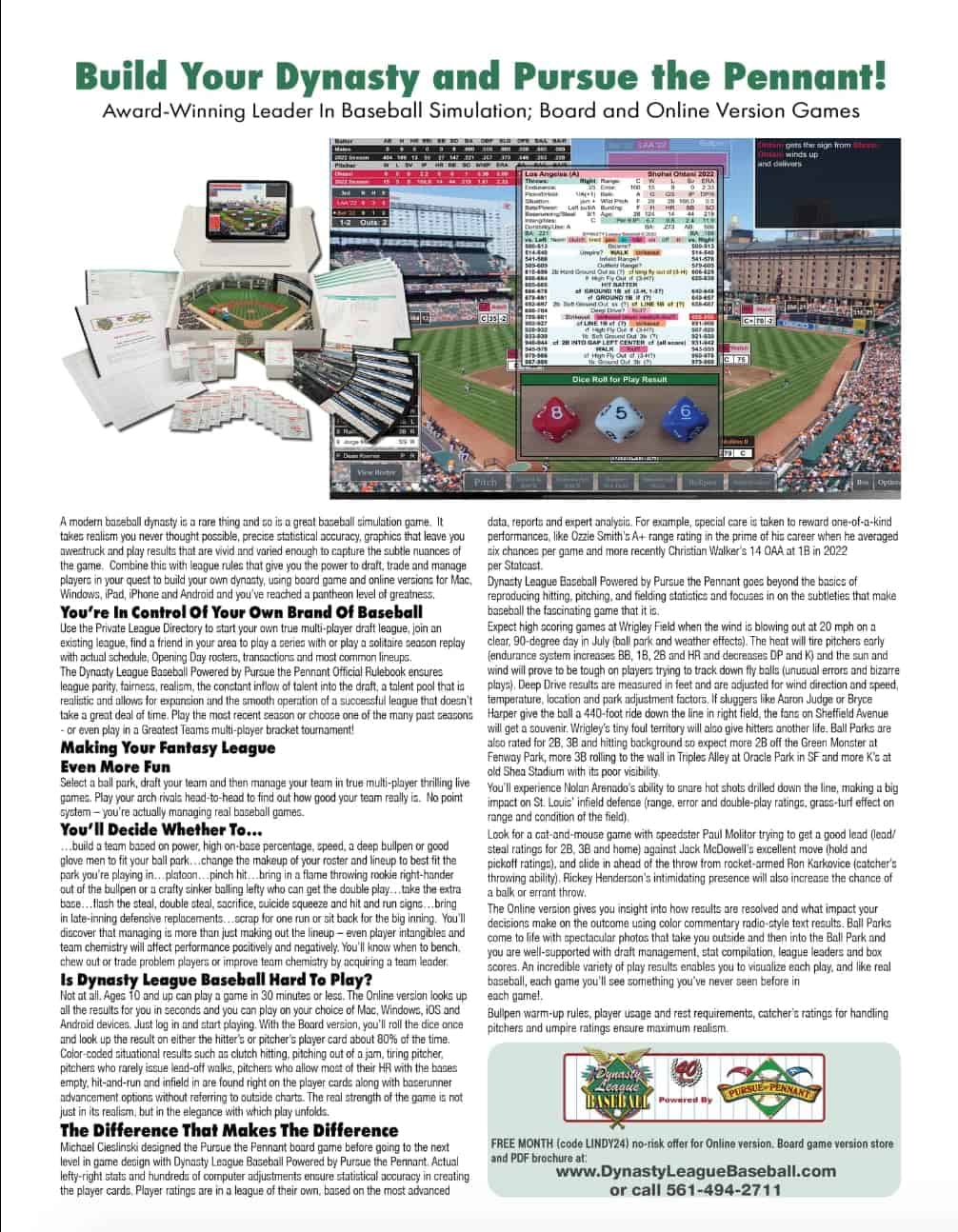 «The Leader In Realism» In National Baseball Hall of Fame archives in Cooperstown Awarded BEST NEW SPORTS GAME by Games Magazine Selected TOP 100 HOBBY GAME of past 50 years «Baseball’s Monopoly on realism» Is the most lifelike, most intriguing, most enjoyable baseball game yet devised…(it’s) the baseball equivalent of Monopoly.» Michael Bauman Milwaukee Journal «Dynasty League Baseball Powered by Pursue the Pennant is, without contest, the most realistic baseball simulation on the market today.» Greg Salvatore Arizona Diamondbacks Official Magazine «I honestly believe that Dynasty League Baseball Powered By Pursue The Pennant changed my life. I knew I needed to play this game, and play the game I did . thousands and thousands and thousands of games. I learned so much, while it brought me so much joy – one way or another that let me down this path of a life in baseball.»