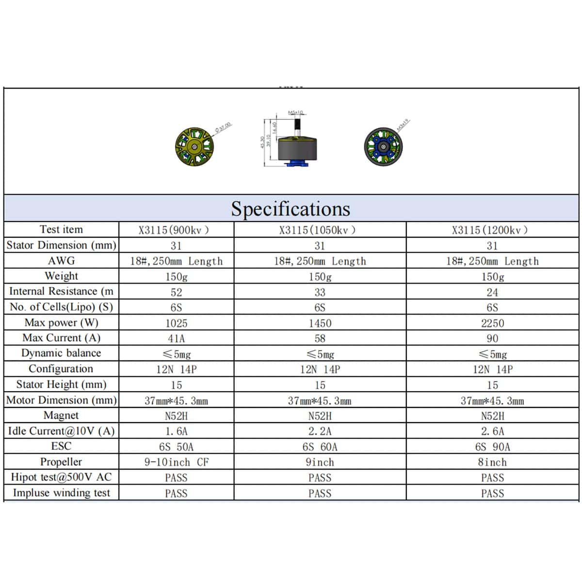 Este motor brushless X3115 900/1050/1200KV, soporta baterías Lipo de 2 a 6 celdas, más potente y mejor rápido. Con un diseño de alto par 12N14P, fuerte empuje, más potente que otros motores brushless ordinarios, alta eficiencia de trabajo. Se utiliza ampliamente en aviones RC, drones, helicópteros, aviones, multicópteros, entre otros.