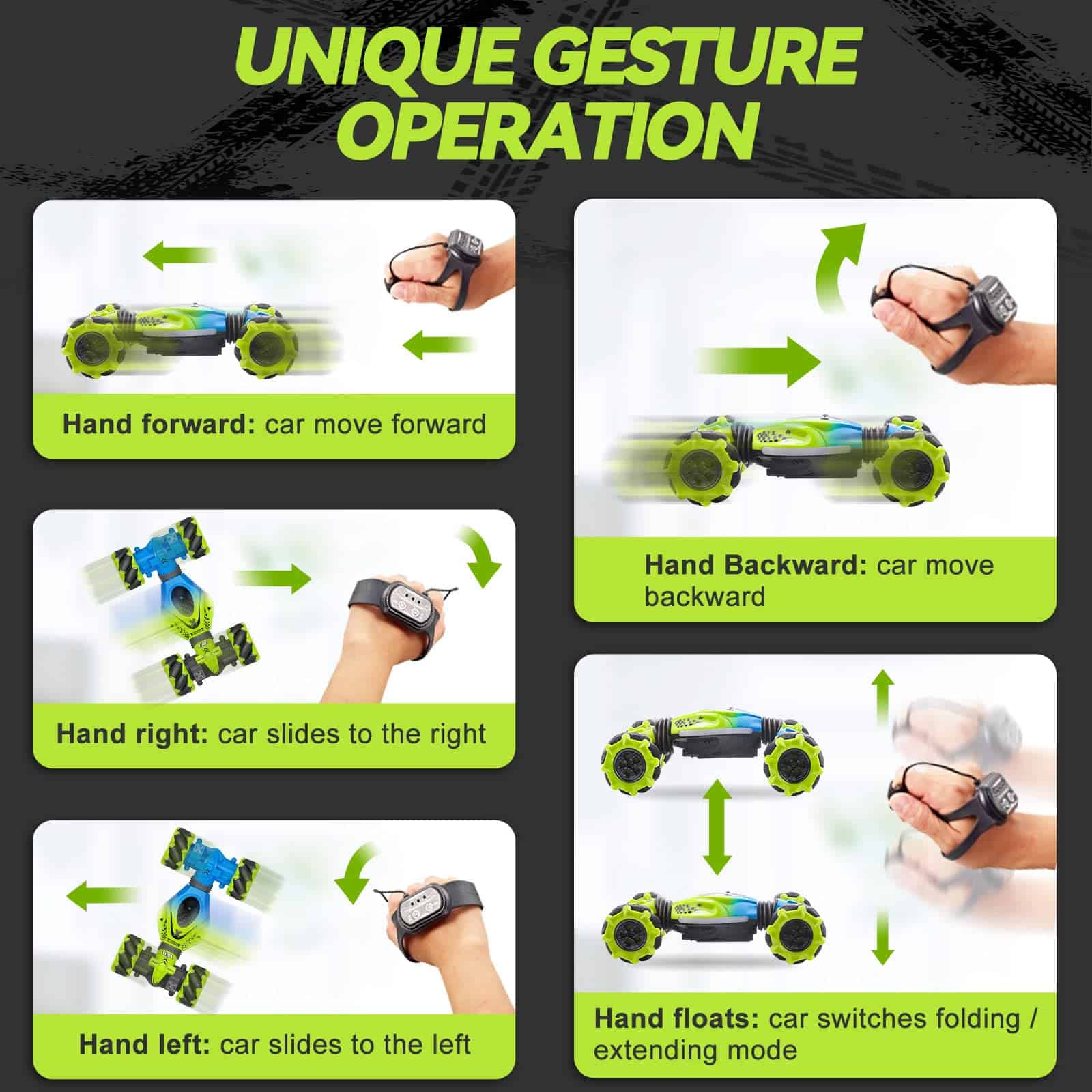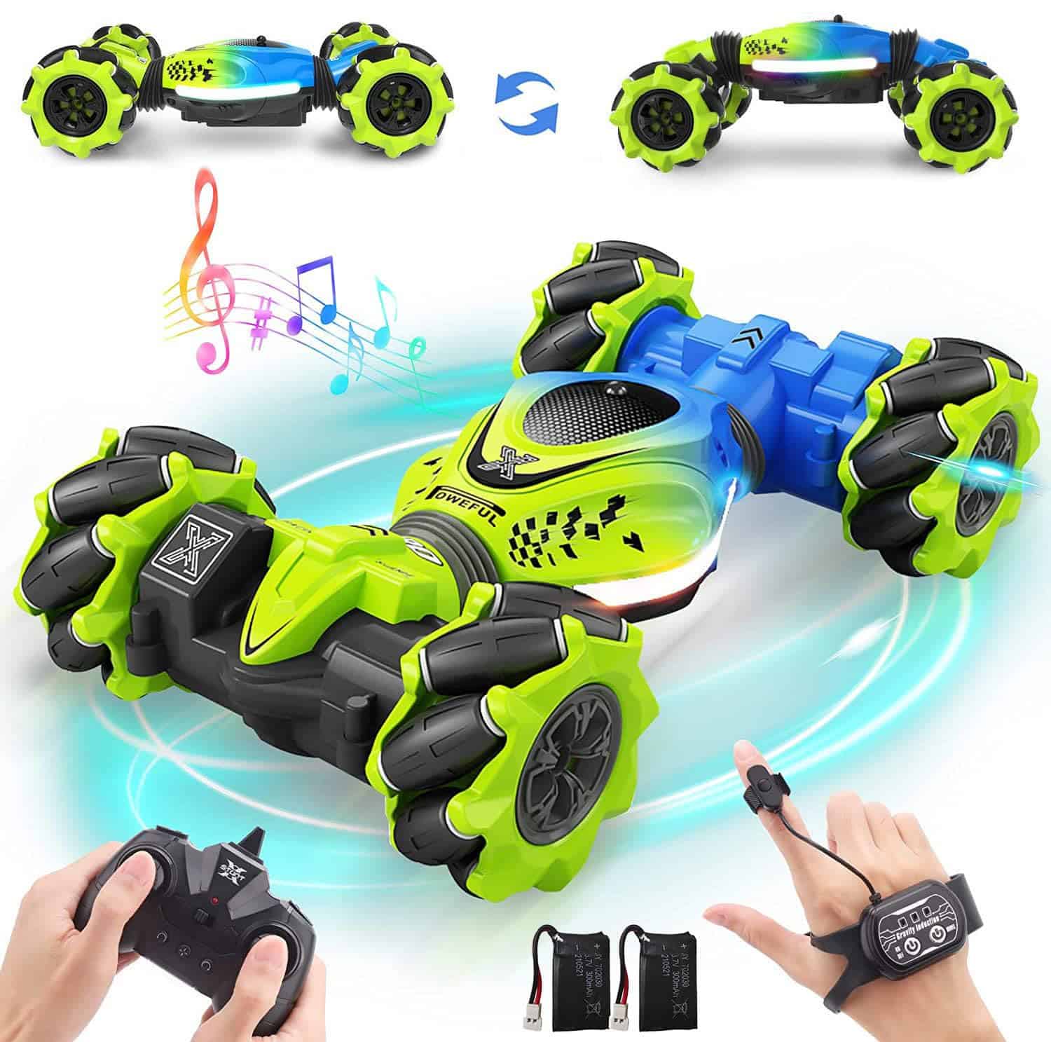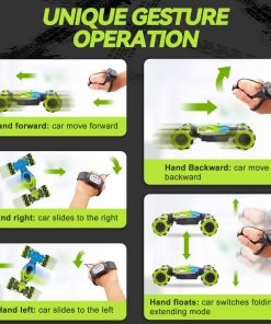 Muti-Formas de Control Remoto – Coche de acrobacias controlado por gestos con 3 modos de control remoto: Control Remoto, Control de Reloj con Sensor de Gravedad, Control de Gestos Sensibles. Solo cambia el gesto y el coche rc de gestos correrá y cambiará de dirección según tus instrucciones. Es un juguete muy genial y fácil de controlar para tus hijos. Tamaño: 7.1 3.9 2.5 pulgadas.