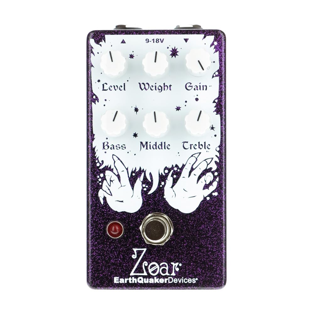 1. Gear Hero Exclusive Purple Sparkle. 2. Este dispositivo requiere una fuente de alimentación de 9-18 voltios de CC con un enchufe estándar de 2.1 mm con centro negativo. Recomendamos utilizar una fuente de alimentación aislada específica para pedales o una fuente de alimentación con múltiples salidas aisladas. Los pedales generan ruido adicional si hay fluctuaciones o alimentación sucia. Las fuentes de alimentación conmutadas, las cadenas en serie y las fuentes de alimentación no específicas para pedales no siempre filtran la alimentación sucia y pueden generar ruido no deseado. ¡NO ALIMENTES EL ZOAR CON MÁS DE 18V!. 3. ¡Este dispositivo cuenta con la Tecnología de Conmutación Flexi-Switch! Este estilo de conmutación bypass verdadero basado en un relé te permite usar simultáneamente estilos de conmutación momentánea y de retención. 4. Controles Sensibles al Tacto. 5. Esta caja meticulosamente elaborada tiene seis perillas que te permiten personalizar realmente tu sonido con los controles de Nivel, Peso, Ganancia, Graves, Medios y Agudos. La luz LED roja indica cuando la distorsión está activada por el pedal con Flexi-Switch habilitado.