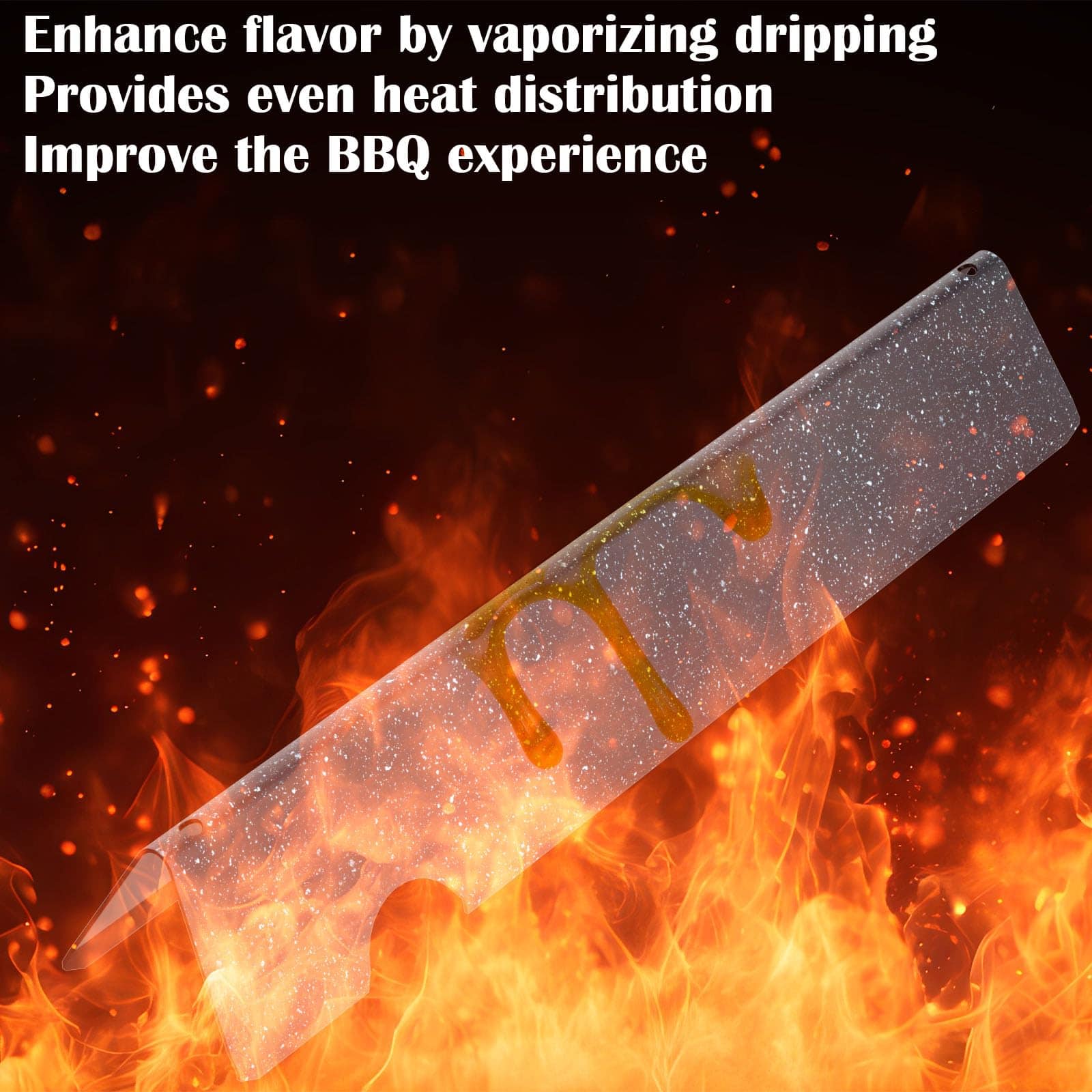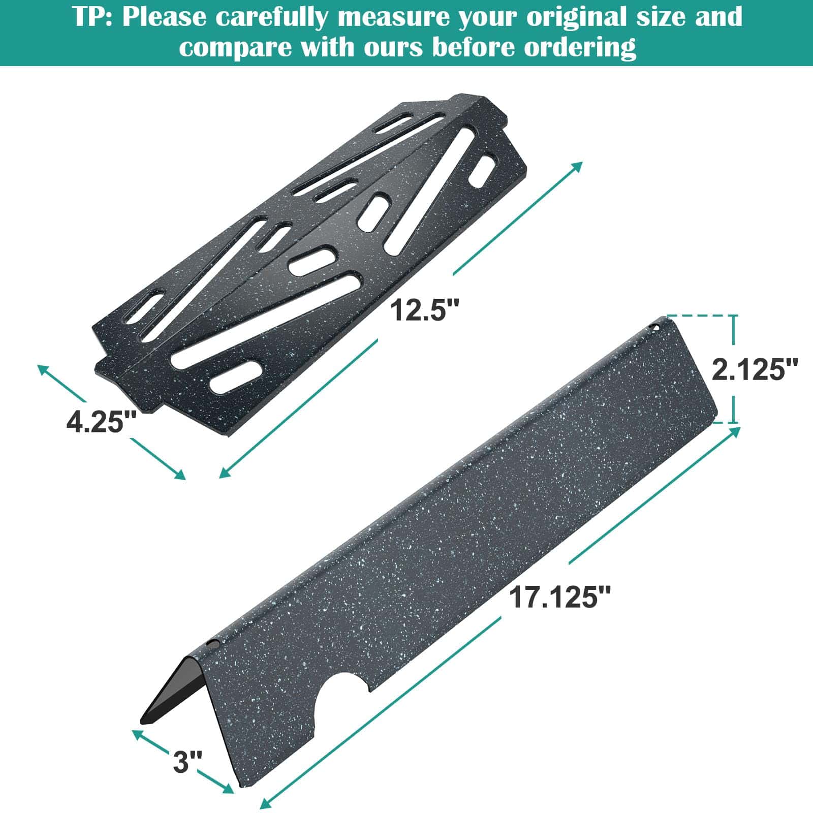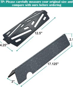 3. Paquete y tamaño de 5 barras de soporizador de sabores y 3 deflectores de calor, tamaño de las barras de sabor: 17.1″ L x 3″ W, tamaño del deflector de calor: 12.5″ L x 4.25 » asegúrese de que el tamaño de la parrilla coincida con nuestros productos.