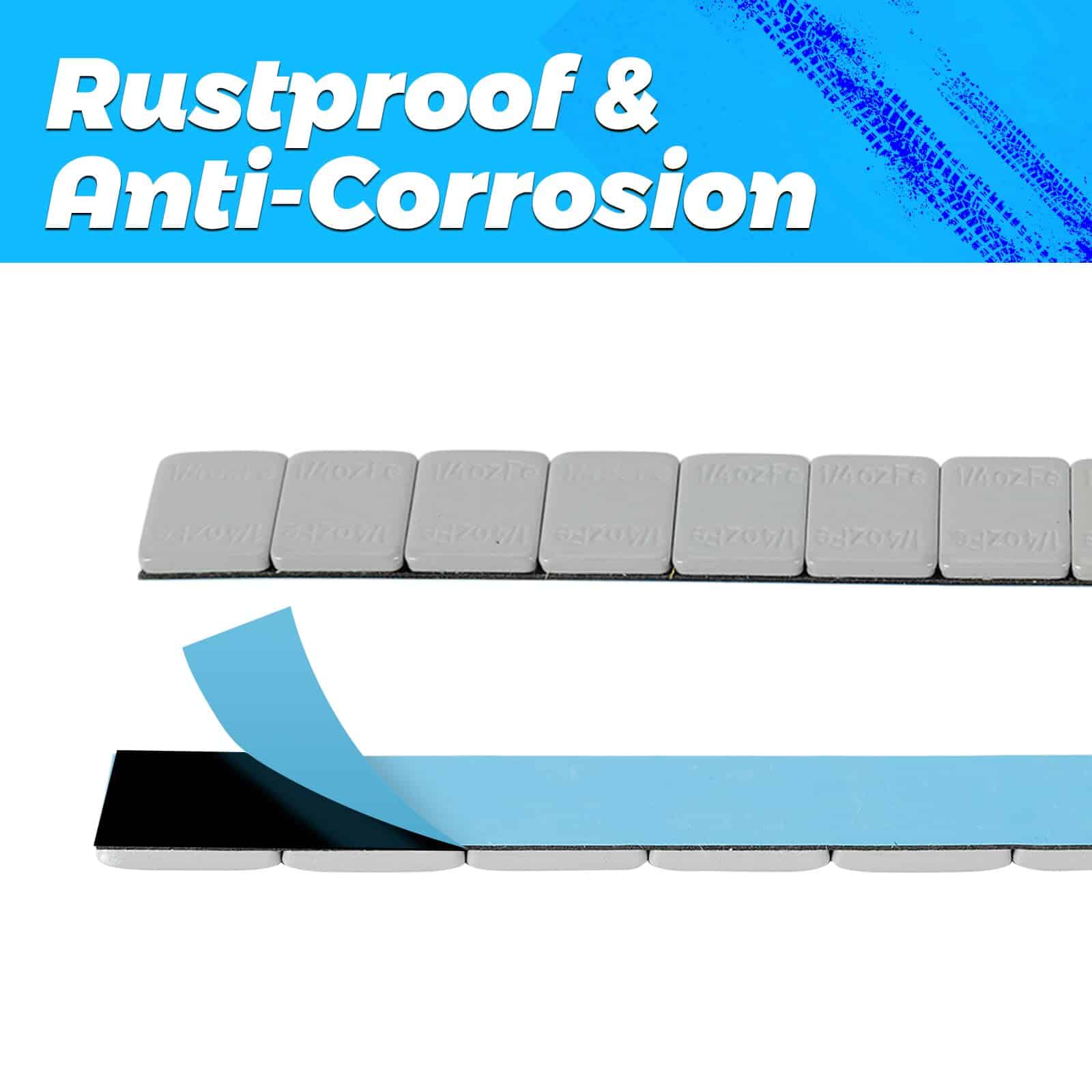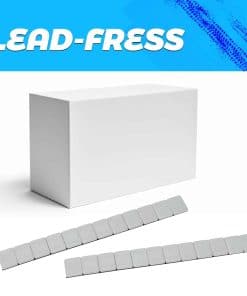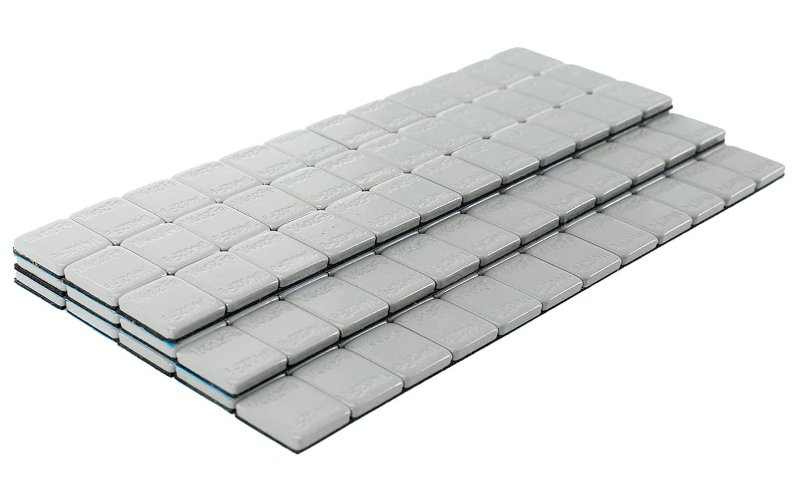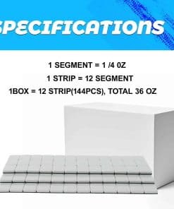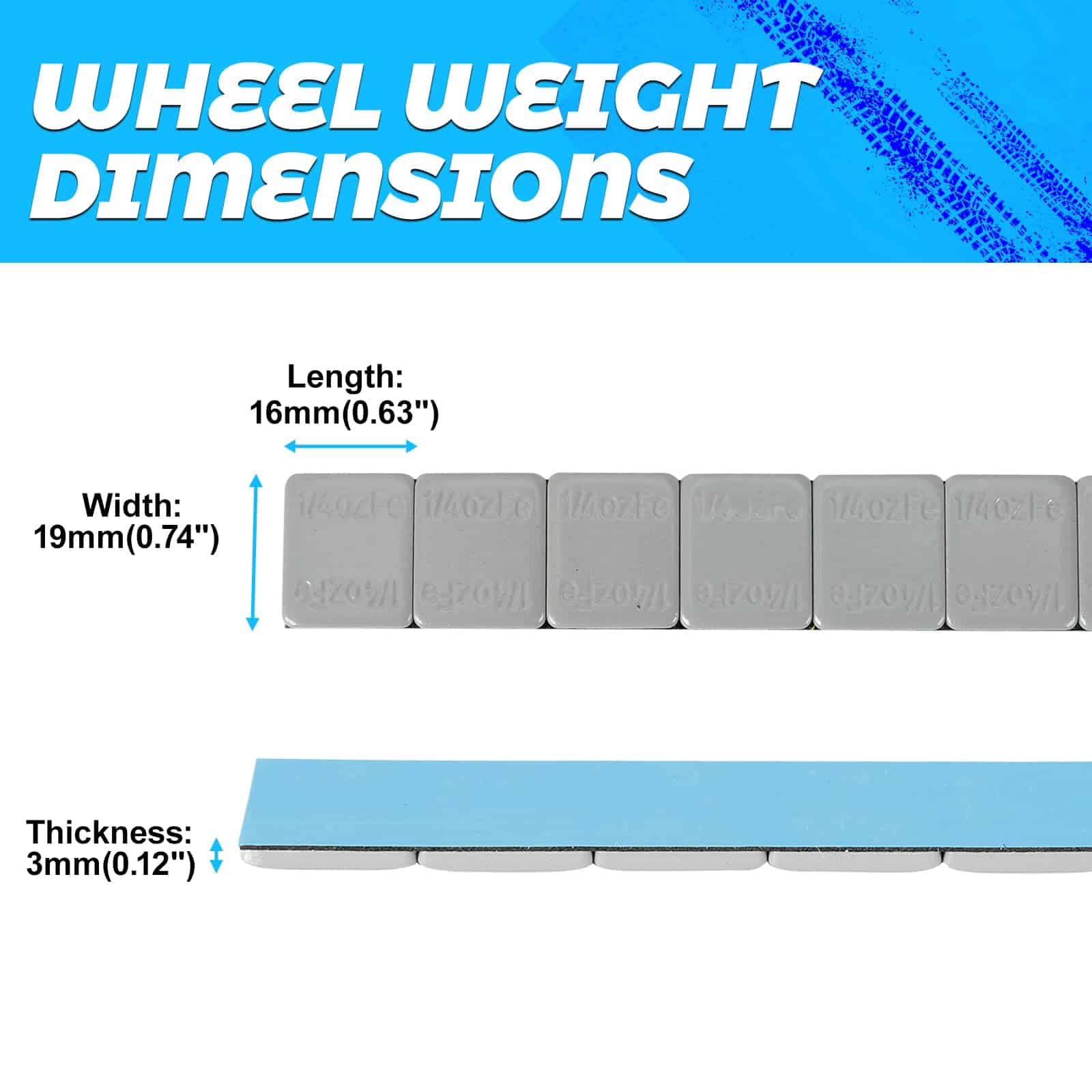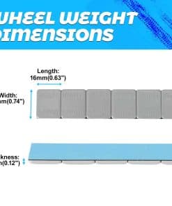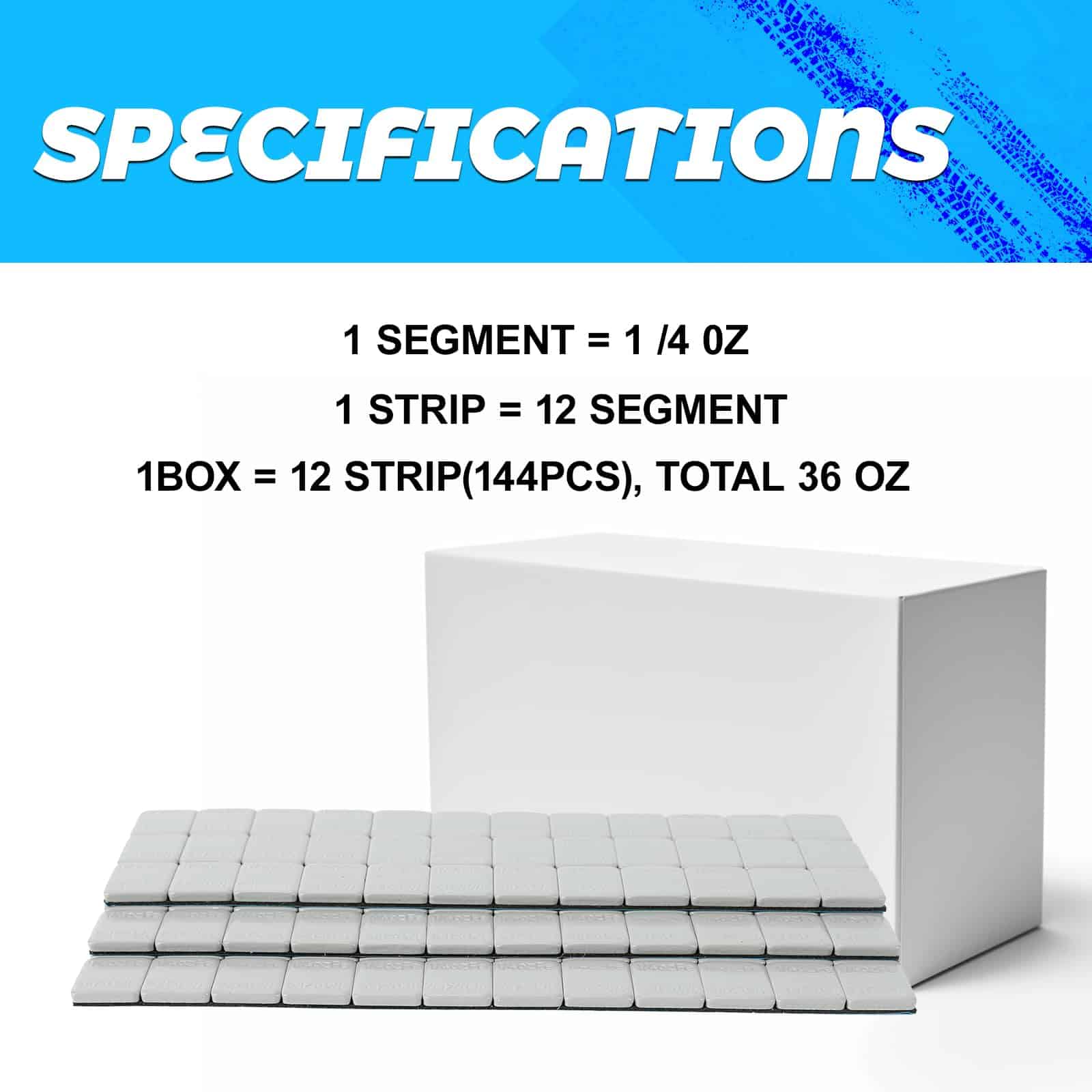 1/4 oz por segmento, 12 segmentos por tira, 60 tiras por caja, Total 180 oz, 720 piezas de pesos de rueda adhesivos por caja.