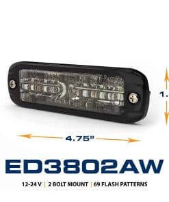 Los LEDs direccionales ED3801 y ED3802 son luces de advertencia brillantes y versátiles adecuadas para una amplia variedad de aplicaciones. Su perfil ultra bajo los hace fáciles de instalar prácticamente en cualquier lugar de un vehículo y son un 25% más delgados que los modelos anteriores. Todos los modelos ofrecen ópticas de ángulo amplio y múltiples patrones de destello, incluida la sincronización con otras unidades para operación simultánea o alternante. Cada color LED se puede controlar de forma independiente.