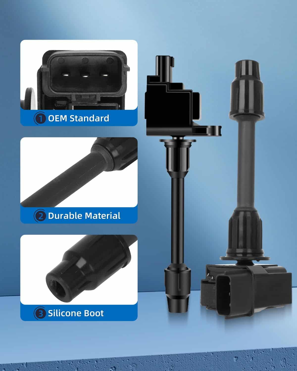 1. Compatibilidad con vehículos: Paquetes de bobinas de encendido compatibles para Infiniti I30 2000 V6 3.0L (Lado trasero), I30 2001 V6 3.0L (Lado delantero); Compatible para Nissan Maxima 2000 V6 3.0L (Lado trasero), Maxima 2001 V6 3.0L (Lado delantero).