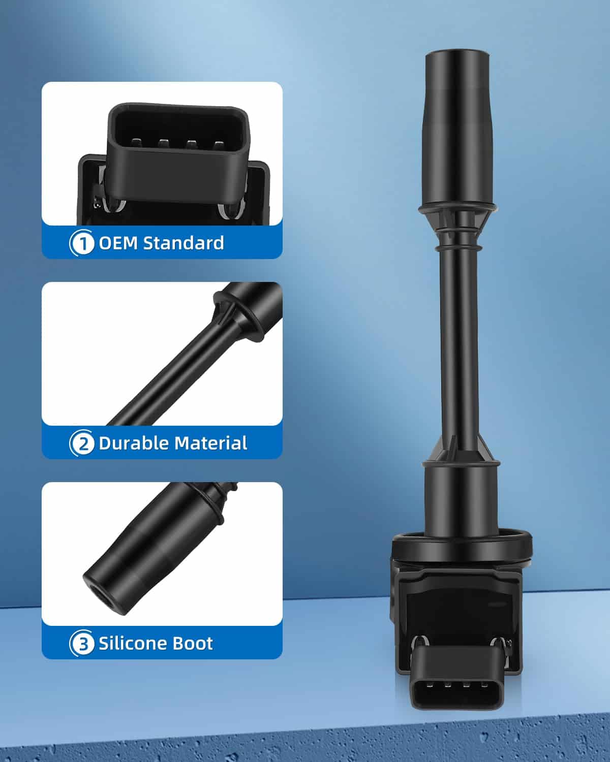 3. Calidad Premium y Vida Útil Larga: Las bobinas y bujías ECCPP están diseñadas para cumplir o superar las especificaciones OEM, mejorando la confiabilidad y el rendimiento. El cable de cobre altamente conductor y la resina epoxi de alto rendimiento dieléctrico, conexiones precisas resistentes a la corrosión garantizan una excelente conectividad eléctrica y una larga vida útil.