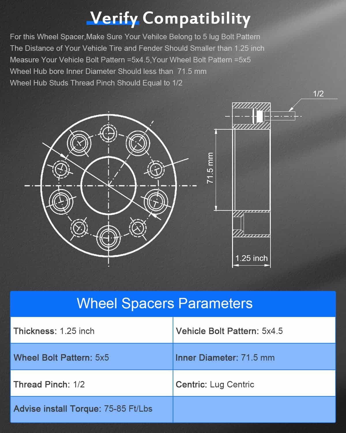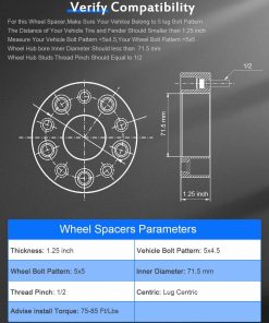 2. ESPECIFICACIONES–Espaciador de rueda de 1.25 pulgadas | Patrón de pernos: 5×4.5 a 5×5 | Tamaño de rosca: 1/2 | Centro de soporte: 71.5mm | Centrado de buje: N | Cantidad: 4PCS | Evite vibraciones no deseadas limpiando a fondo el cubo y las superficies a emparejar de óxido y residuos antes de la instalación, proporcionando un viaje suave y estable.
