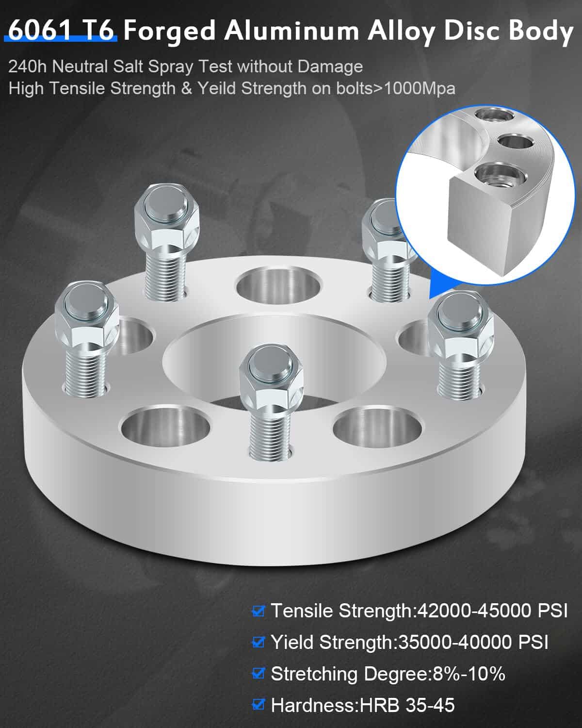 3. ARTESANÍA–Nuestros espaciadores de rueda de 5×4.5 a 5×5 están hechos del gran aluminio billet T-6 verdadero. Los pernos de nuestro espaciador de rueda son de grado 10.9, pernos endurecidos y tratados térmicamente de alta resistencia, mejoran la dureza del material.
