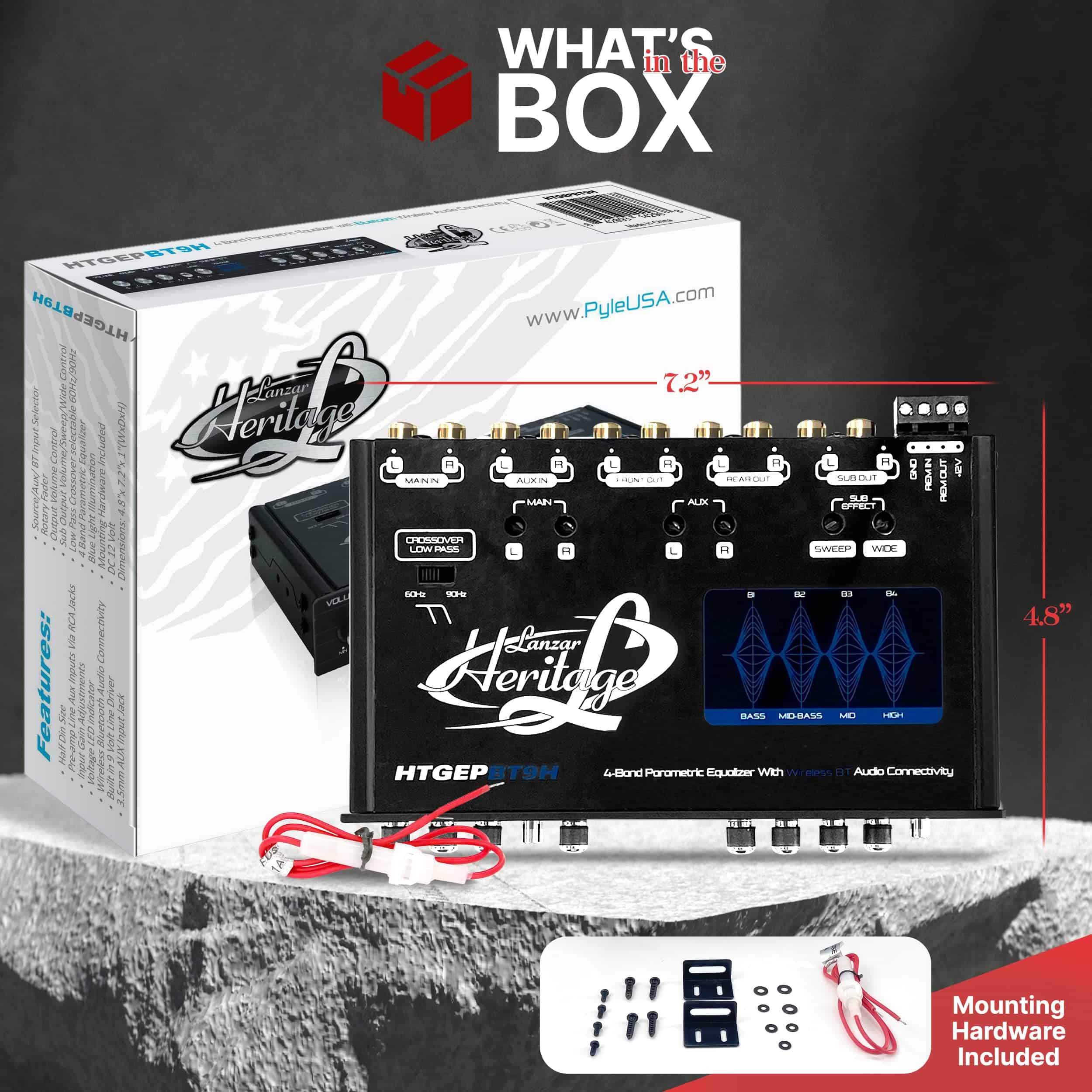 Presentamos el Ecualizador Paramétrico de 4 Bandas con Conectividad de Audio Inalámbrica Bluetooth – la solución de audio definitiva para entusiastas de la música y profesionales por igual. Diseñado en un compacto tamaño medio DIN, este ecualizador está repleto de funciones para mejorar tu experiencia de audio. Incluye entradas auxiliares de pre-amplificador a través de conectores RCA, ajustes de ganancia de entrada e un indicador de LED de voltaje para un control preciso. Disfruta de la conveniencia de la conectividad de audio Bluetooth inalámbrica con un emparejamiento simple y sin complicaciones compatible con todos tus dispositivos más recientes, incluidos smartphones, tablets y computadoras. El dispositivo también cuenta con un conector de entrada auxiliar de 3.5mm, un selector de entrada de fuente/Aux/BT, un regulador rotativo y control de volumen de salida, junto con control de volumen de salida de subwoofer, sweep y amplio. Con un impulso de 18 dB y un crossover de paso bajo seleccionable a 60Hz o 90Hz, el Ecualizador Paramétrico de 4 Bandas te permite ajustar tu sonido a la perfección. Está bellamente iluminado con luz azul y viene con todos los hardware de montaje necesarios incluidos. Construido con una construcción duradera de hierro y aluminio, opera con una potencia de salida de DC 12V y ofrece una salida de pre-amplificador de 9V RMS. Compacto pero potente, sus dimensiones son de 4.8» x 7.2» x 1.0» pulgadas, lo que lo convierte en una excelente adición a cualquier configuración de audio. Eleva tu sonido con la versatilidad y rendimiento incomparables del Ecualizador Paramétrico de 4 Bandas con Conectividad de Audio Inalámbrica Bluetooth.