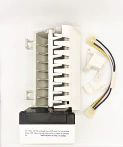 Sustituto de los números 2198597, 2198598, 626663, AP3182733, PS869316, W10190960 y W10122502. Los refrigeradores modelo para los que sirve este producto utilizan una unidad de detección de emisión de placa PC para determinar cuándo el cubo de hielo está lleno y apagar el fabricante de hielo. Los cubos se desechan directamente en el contenedor de hielo en la puerta del congelador. Este fabricante de hielo es para refrigeradores de lado a lado con contenedor de hielo en la puerta e incluye una conexión plana rectangular de 4 pines que mide 10.5″ de longitud. El cable está protegido por un fusible.