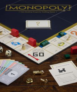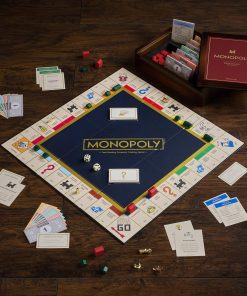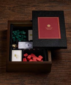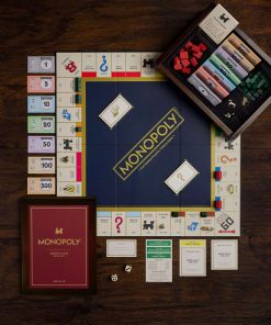 La caja del juego es un libro de madera teñida de nogal con almacenamiento integrado. En su interior encontrarás un tablero de juego plegable de tamaño completo y los siguientes accesorios: 32 Casas de madera verdes, 12 Hoteles de madera rojos, Cartas de Suerte, Comunidad y Títulos de Propiedad, Dinero MONOPOLY, 2 Dados de color marfil, e instrucciones. Se incluyen seis piezas clásicas de jugador (fichas): Bota, Barco de guerra, Coche de carrera, Perro scottie, Dedal, Sombrero.