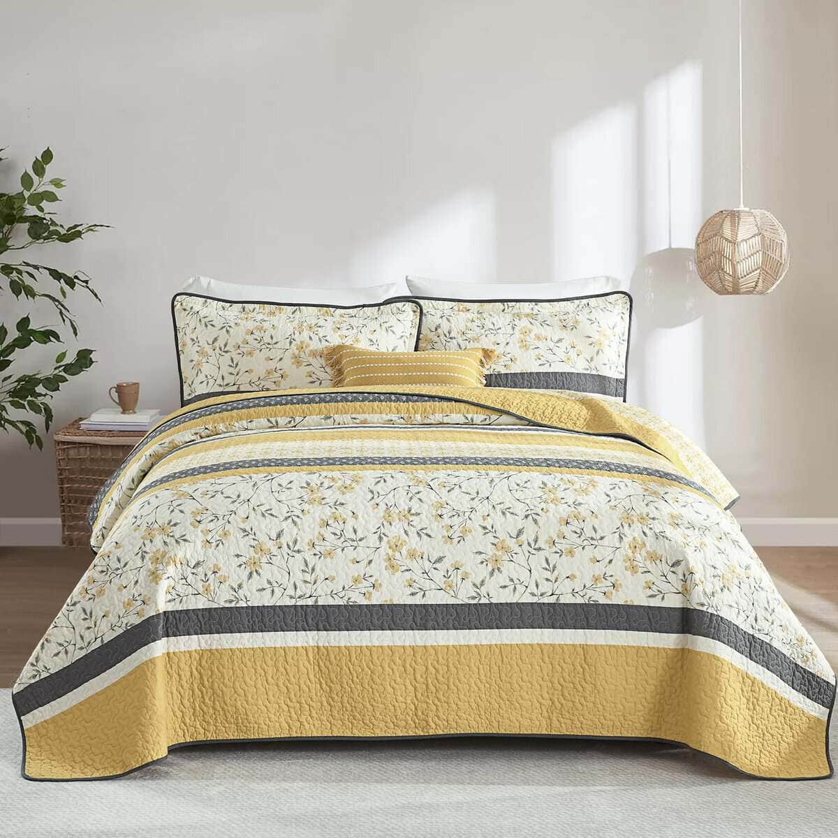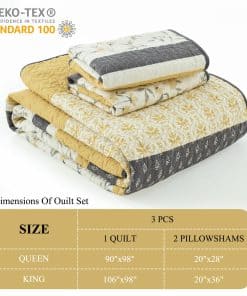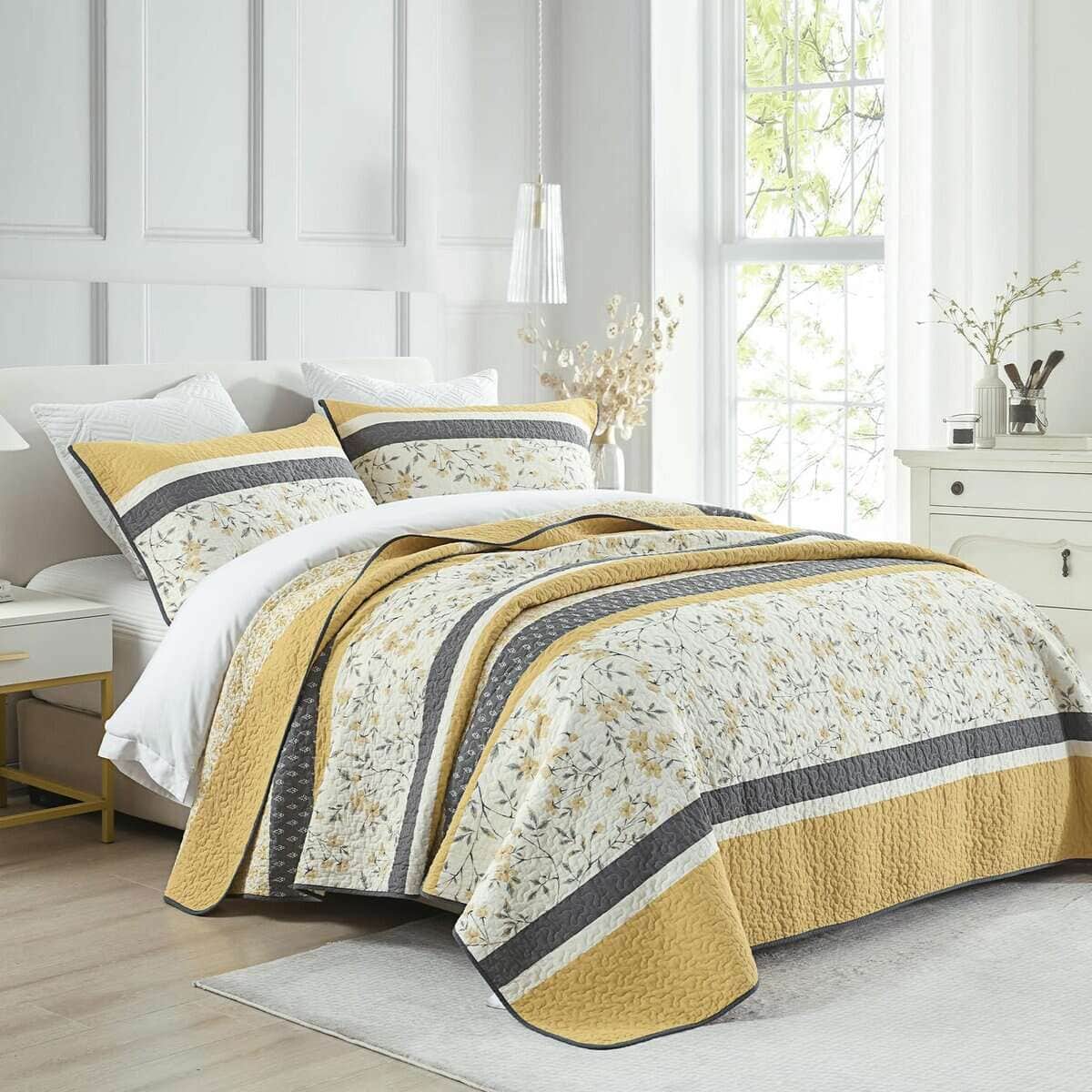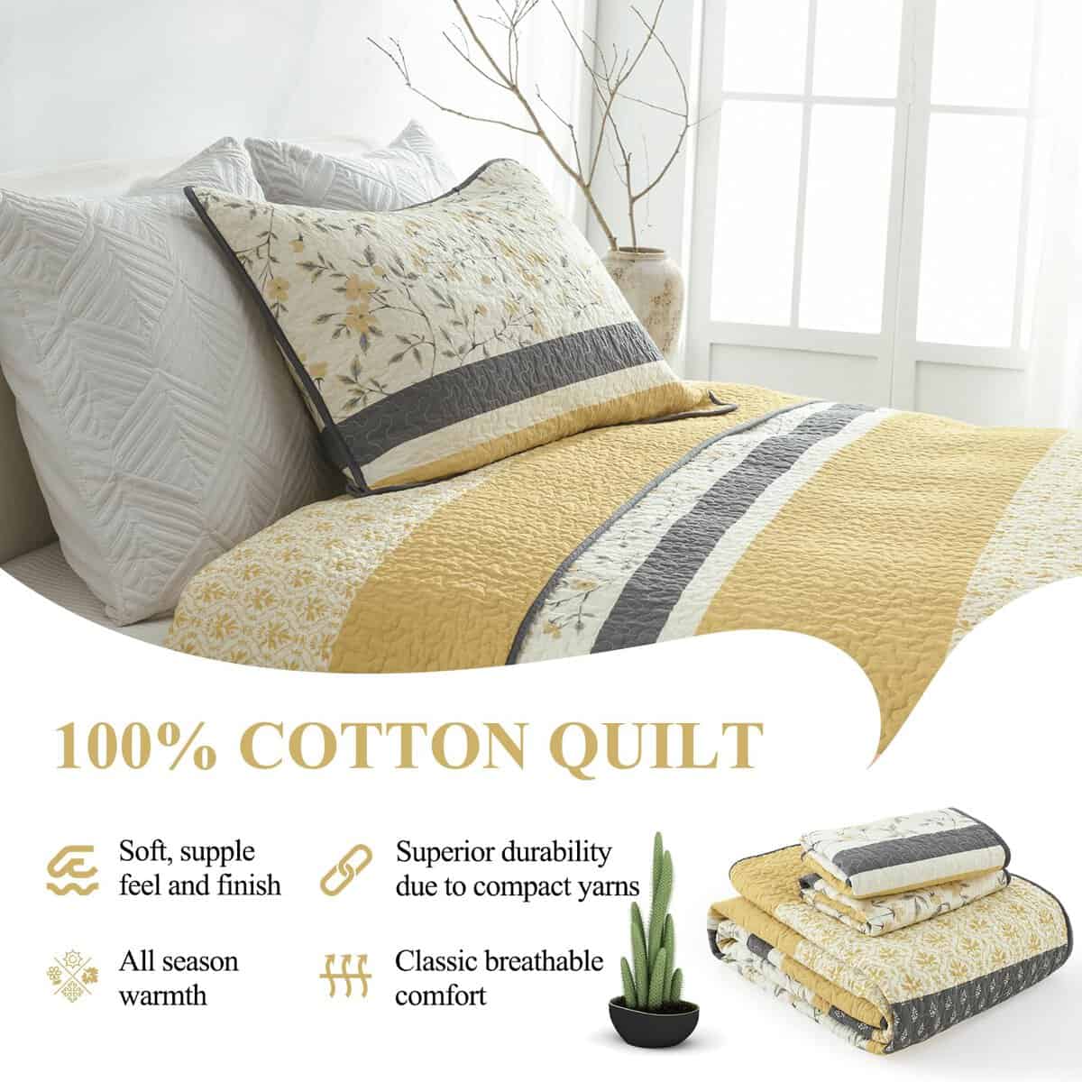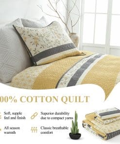 Este juego de edredón tamaño Queen de DDUOXIN es la combinación perfecta de confort, durabilidad y estilo elegante. Fabricado con 100% algodón de alta calidad, es suave al tacto, ligero y cómodo para todas las estaciones. La cuidadosa costura experta garantiza su durabilidad excepcional, para que puedas disfrutar de la belleza y comodidad de este edredón durante muchos años. El diseño elegante del edredón a rayas en amarillo dorado, gris y blanco traerá la belleza de la naturaleza a tu dormitorio. Los patrones intrincados son visualmente impresionantes y se complementan con cualquier tipo de decoración. El juego de edredón de 3 piezas incluye un edredón reversible de tamaño queen (90 x 98 pulgadas) y 2 fundas de almohada (20 x 28 pulgadas), lo que lo convierte en un regalo práctico y reflexivo para ti mismo o para alguien especial. Este edredón se puede utilizar durante todo el año, ya que es ligero para mantenerse fresco en las noches de verano y ofrece una capa extra de confort durante las noches frías de invierno. Además, es fácil de cuidar, ya que se puede lavar a máquina por separado en agua fría, secar a baja temperatura y no necesita ser blanqueado. Añade este hermoso juego de edredón queen a tu hogar para disfrutar de calidez y comodidad cuando lo necesites.