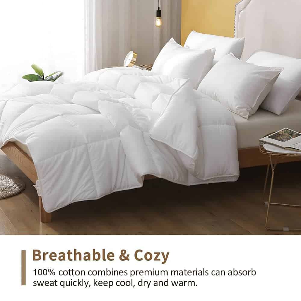 Edredón alternativo ligero de alta calidad con una funda de tejido de algodón 100% que presenta una mezcla premium de 70% poliéster, 20% poliéster Climaloft y 10% lyocell para una comodidad excepcional y durabilidad duradera. Diseñado con Tecnología Eco2 de absorción de sudor para una suavidad excepcional y absorción de humedad, este edredón cuenta con acolchado de caja cosido de extremo a extremo que evita el desplazamiento y elimina los puntos fríos para una comodidad óptima durante la noche. Disponible en pesos ligeros y para todas las estaciones, la opción ligera es ideal para uso durante todo el año, manteniendo a los durmientes frescos en verano y cálidos en invierno. La construcción de calidad de hotel garantiza durabilidad, resistencia a la decoloración y a las arrugas. Este edredón también incluye cuatro lengüetas en las esquinas para unión fácil de la funda y presenta una superficie de doble cepillado para mayor suavidad. Fácil de cuidar, mantiene su forma después de múltiples lavados y es lavable a máquina y apto para secadora para una mayor comodidad y conveniencia.