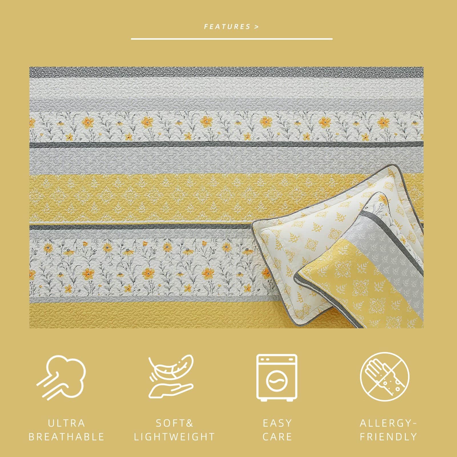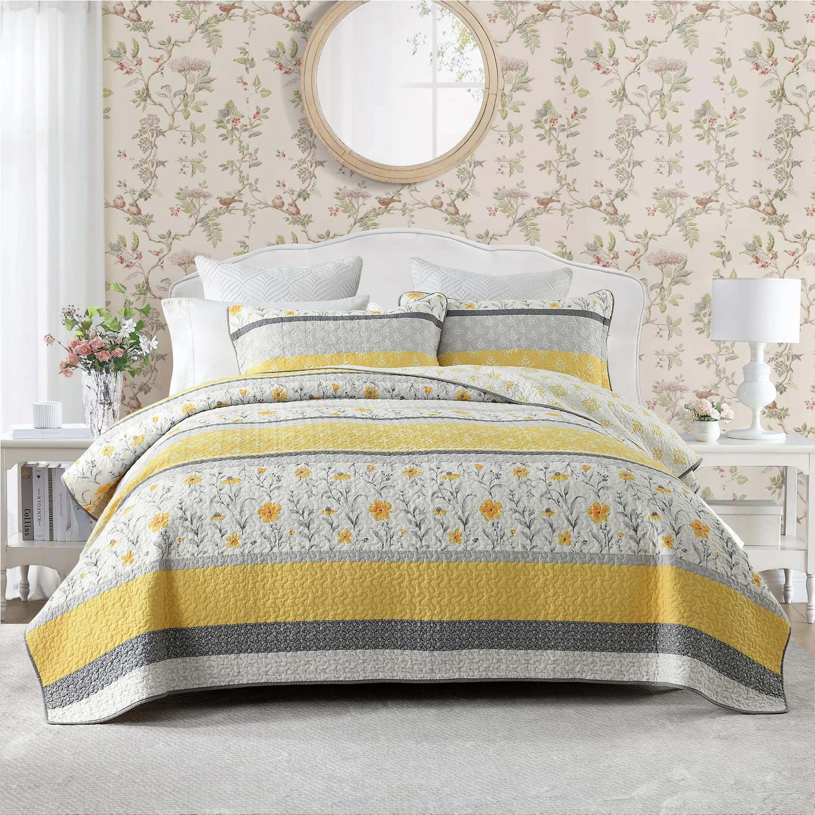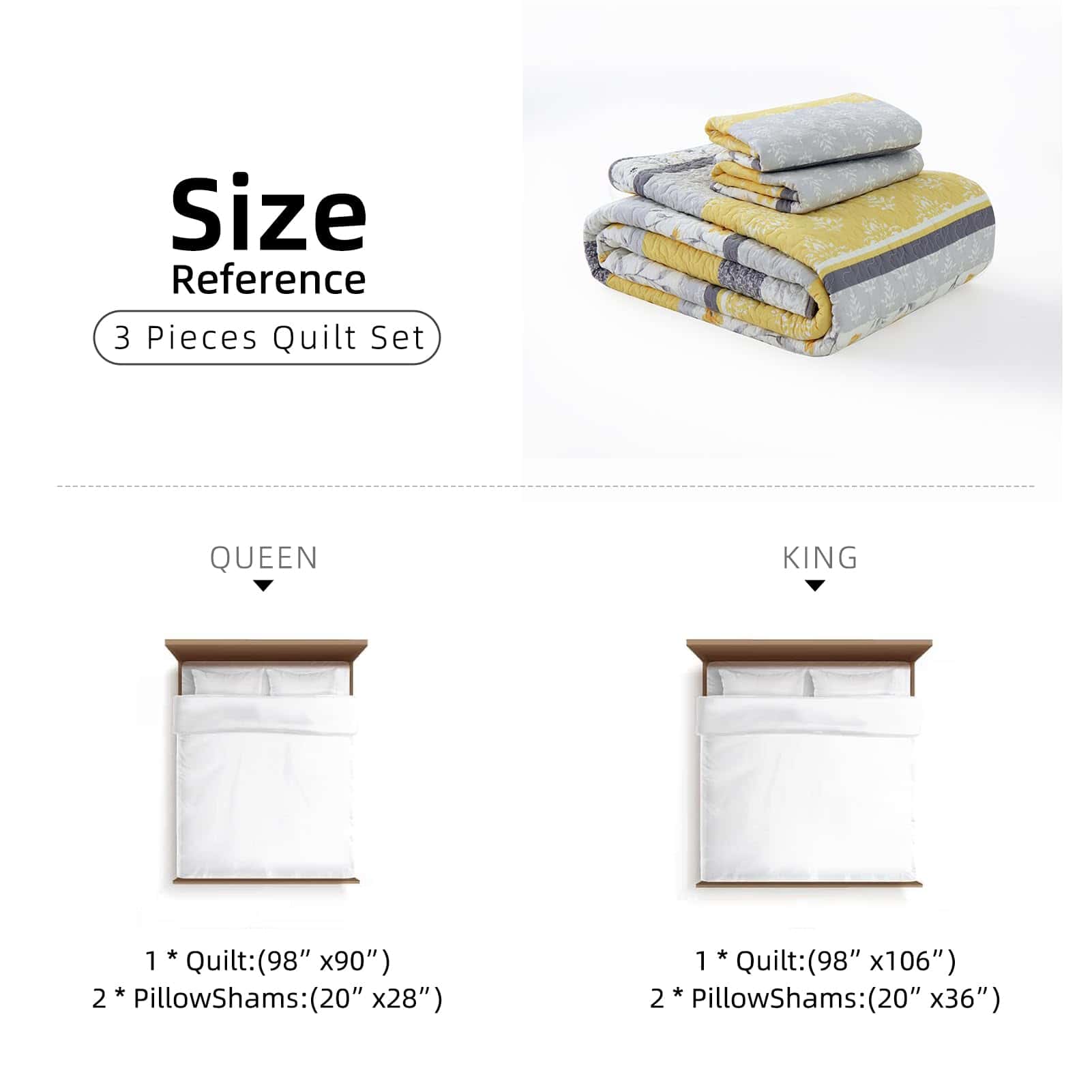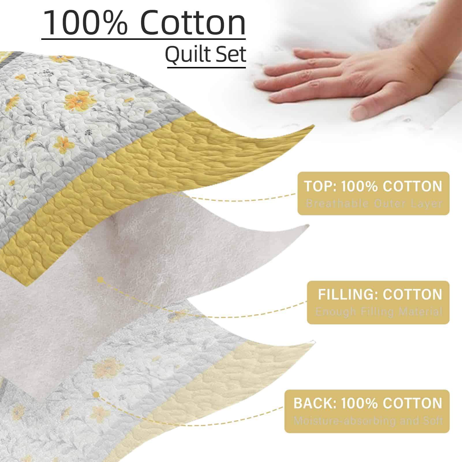 2. Diseño Único – Mezclando elementos clásicos de flores amarillas y rayas, este edredón suave combina frescura natural con un diseño elegante. El patrón floral aporta una vibra cálida y rústica, mientras que las rayas añaden un aspecto minimalista y moderno que refrescará tu habitación. También es un regalo pensativo para Acción de Gracias, inauguraciones o cumpleaños. 3. Versátil – Este set de colcha se puede usar como un elegante cubrecama, colcha, manta o manta decorativa. Su diseño versátil es fácil de combinar con una variedad de estilos de habitación, incluyendo dormitorio, sala de estar, dormitorio principal, habitación de invitados, oficina en casa, dormitorio universitario, caravana o incluso camping. 4. Exquisita Artesanía – Este juego de ropa de cama está expertamente fabricado con costuras firmes y bordes suaves, asegurando que el relleno de algodón permanezca uniforme y consistente. Evita bultos y desplazamientos después de usarlo o lavarlo, lo que lo hace tanto hermoso como práctico. 5. Certificado OEKO-TEX – Este juego de edredón de algodón 100% cuenta con la certificación OEKO-TEX STANDARD 100, garantizando que los materiales son seguros y libres de sustancias dañinas. Tú y tu familia pueden dormir cómodamente y con confianza todas las noches. 6. Cuidado Fácil y Mantenimiento – Este set de colcha amarillo y gris es lavable a máquina en agua fría en un ciclo suave. Secar a baja temperatura. No usar lejía. La tela resiste la decoloración y el encogimiento, manteniendo su aspecto fresco lavada tras lavada, perfecto para hogares ocupados. 7. Set de Edredón King – Este juego de edredón de patchwork floral incluye 1 edredón (106″x98″) y 2 fundas de almohada (20″x36″). VatinHK se compromete a ganarse la confianza y satisfacción a través de un servicio al cliente excepcional. Si tienes alguna pregunta, no dudes en contactarnos.
