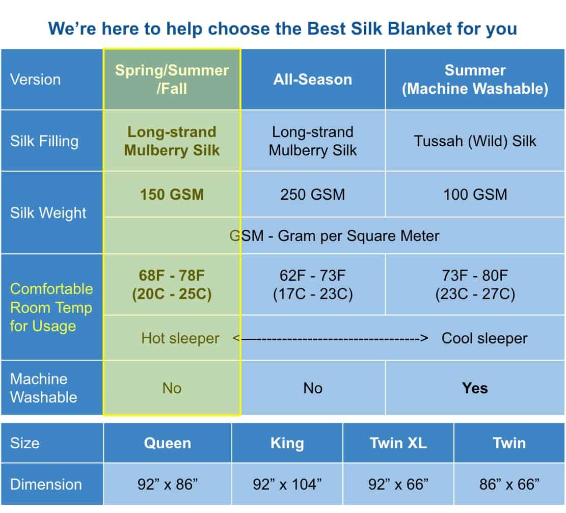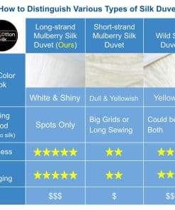 Materiales: El relleno está hecho de seda de morera de calidad premium al 100%, que es orgánica, ultra suave, suave, transpirable, ultra resistente, reguladora de la temperatura y abrazadora del cuerpo. La cubierta está hecha de algodón orgánico premium al 100%. Detalles: Una cremallera corta en el lado para la inspección de autenticidad del relleno de seda. Ocho lazos están diseñados para asegurar el edredón en su lugar con tu cubierta de edredón. Ocasión: Este Edredón con Relleno de Seda de peso Primavera / Verano es perfecto para primavera / verano / otoño o clima tropical con AC. Contiene 1.29 LBs de hebra de seda de morera larga (150 gramos por metro cuadrado). Diseñado en California, Fabricado en China por sastres de primera categoría.