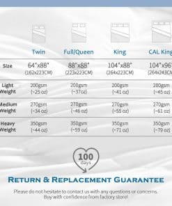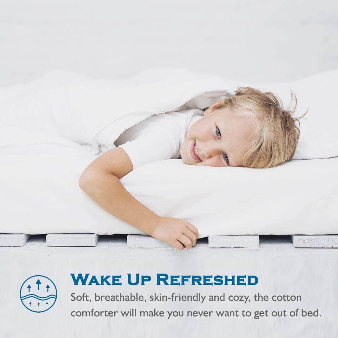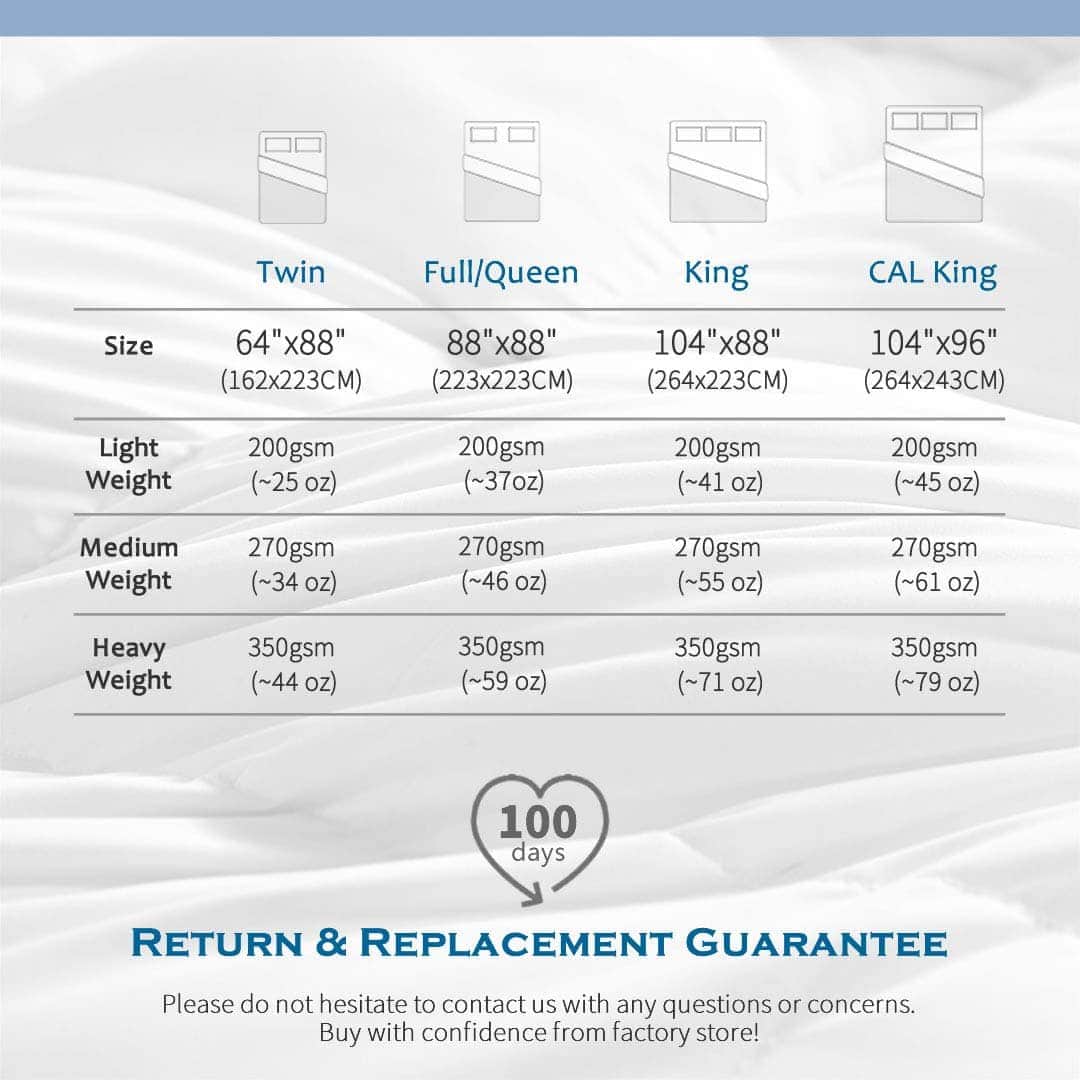 Ideal para todas las estaciones; el edredón ligero es perfecto para la mayoría de las personas en primavera, verano y otoño, o para los que tienen calor durante todo el año. El relleno de microfibra reciclada estándar GRS único garantiza una suavidad superior y absorción de humedad; aprobado por el estándar OEKO-Tex 100 y perfecto para el uso familiar. La construcción de calidad incluye acolchado en caja que distribuye uniformemente el relleno para evitar que se desplace y sin formación de grumos o puntos fríos; costuras de doble aguja para evitar fugas; ribete de tela auténtica para mayor durabilidad. Instrucciones de cuidado: Empacado al vacío para el envío; desempaque y esponje suavemente y permita que recupere la forma durante unas horas, o use una secadora para restaurar la esponjosidad del edredón; se recomienda usarlo con una funda de edredón para prolongar su vida útil.