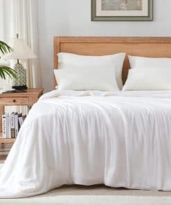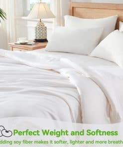 Edredón de Bambú Viscosa King Size, Manta Ligera de Lujo para Verano/Personas Calurosas, Cubierta de Bambú Viscosa Natural, Relleno Orgánico Transpirable, Doble Costura, Blanco – Este edredón de lujo está diseñado para ofrecer frescura natural y una sensación sedosa durante las noches calurosas de verano. La tela del edredón está hecha de viscosa derivada del bambú, lo que proporciona un enfriamiento natural y alta transpirabilidad. El relleno orgánico de fibra de soja y fibra transpirable garantiza una experiencia de sueño cómoda y sin sudor. La ligereza y suavidad del edredón lo hacen perfecto para aquellos que buscan un descanso reparador. La durabilidad del edredón está garantizada por el firme mantenimiento del relleno en su lugar y las costuras de calidad que resisten el uso regular sin comprometer su integridad. Certificado por OEKO-Tex 100, este edredón garantiza una calidad sin preocupaciones. Además, el soporte postventa 24/7 asegura que tu experiencia con el edredón sea siempre satisfactoria.