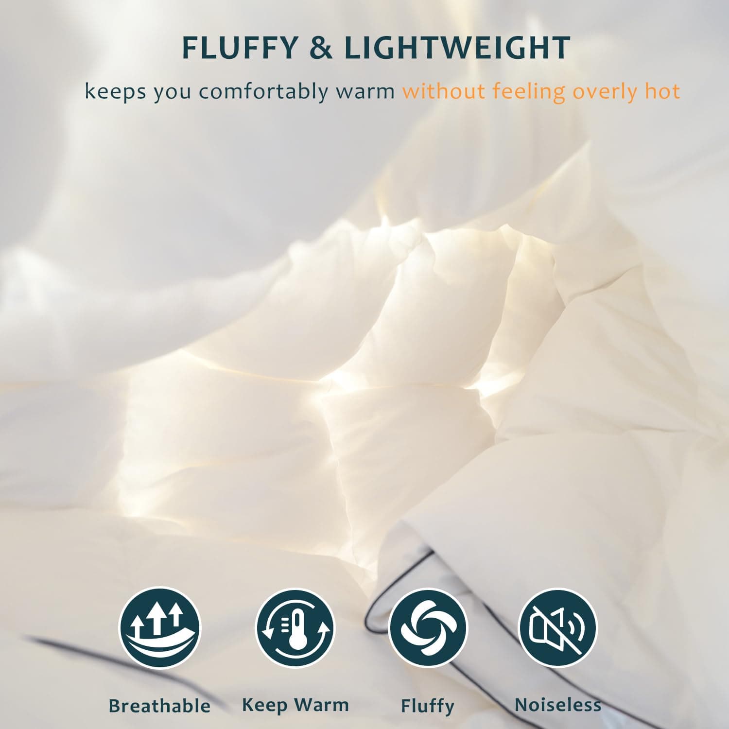 Experimenta la extraordinaria comodidad y lujo que solo la mejor fibra de plumón puede ofrecer con nuestro edredón de fibra de plumón de lujo en tamaño Queen. Cada edredón está completamente lleno con una suave fibra de plumón de 800 fill power, esponjosa y liviana, que te mantiene cómodamente cálido sin sentirte excesivamente caliente.