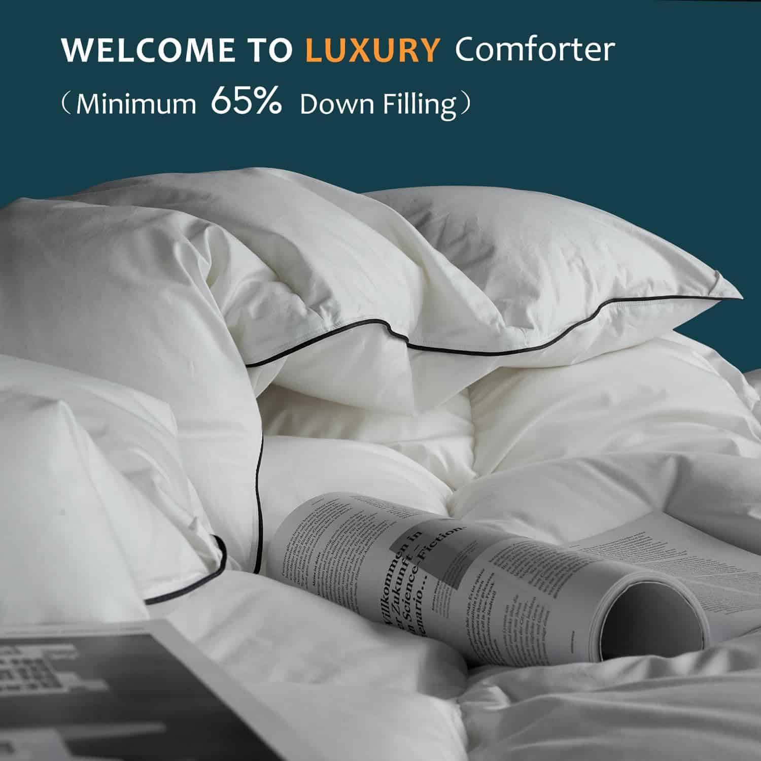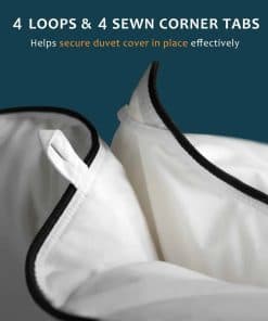 Este edredón de fibra de plumón está elaborado con detalles exquisitos, con doble costura y confección experta. Cuenta con un ribete negro distintivo que no solo le da una apariencia lujosa, sino que también evita que el plumón se escape. Además, tiene 4 bucles y 4 pestañas cosidas en las esquinas que pueden sujetar la funda de edredón de manera efectiva.