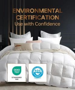 Edredón queen de pluma es de 90 x 90 pulgadas y está relleno con 50 oz de peso de llenado. El tamaño del edredón queen está hecho de un llenado de plumas de alta loft responsablemente obtenido (80% plumas, 20% plumas), y está certificado por Responsible Down Standard (RDS), DOWNPASS. Nuestro edredón queen no tiene olor. La funda de edredón queen está hecha de 100% algodón y ha pasado la certificación OEKO-Tex Standard 100. La funda de edredón queen está hecha de una mezcla de alto recuento de hilos, haciendo que la manta de plumas sea más suave y más transpirable, como dormir en una nube, y puedes disfrutar de esta comodidad en clima frío, primavera, otoño o invierno. El inserto del edredón de plumas queen cuenta con una construcción de caja en 3D con costuras de alta calidad para garantizar que las plumas ligeras se distribuyan uniformemente y evite que se desplacen o se agrupen. El relleno se expande completamente para crear máxima esponjosidad, haciendo que el edredón de plumas sea tan esponjoso como una nube, eliminando los puntos fríos. Se utiliza costura doble para evitar que las plumas se escape. Los 4 lazos y las 4 pestañas de esquina cosidas aseguran que el edredón permanezca en su lugar dentro de la funda de edredón. Empaque de regalo: El nuevo edredón queen de caja de plumas viene envasado al vacío e incluye una bolsa no tejida para guardar el edredón y mantenerlo limpio. Después de recibir el edredón queen de plumas, retírelo del empaque, dele un sacudida suave y luego espere unas horas para permitir que recupere completamente su estado suave y esponjoso. Sabemos la importancia de una buena noche de sueño, por eso ofrecemos un edredón queen de plumas diseñado para mejorar la calidad del sueño. Estamos seguros de que te encantará nuestro edredón de plumas de ganso.