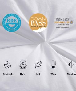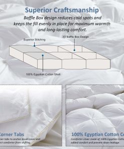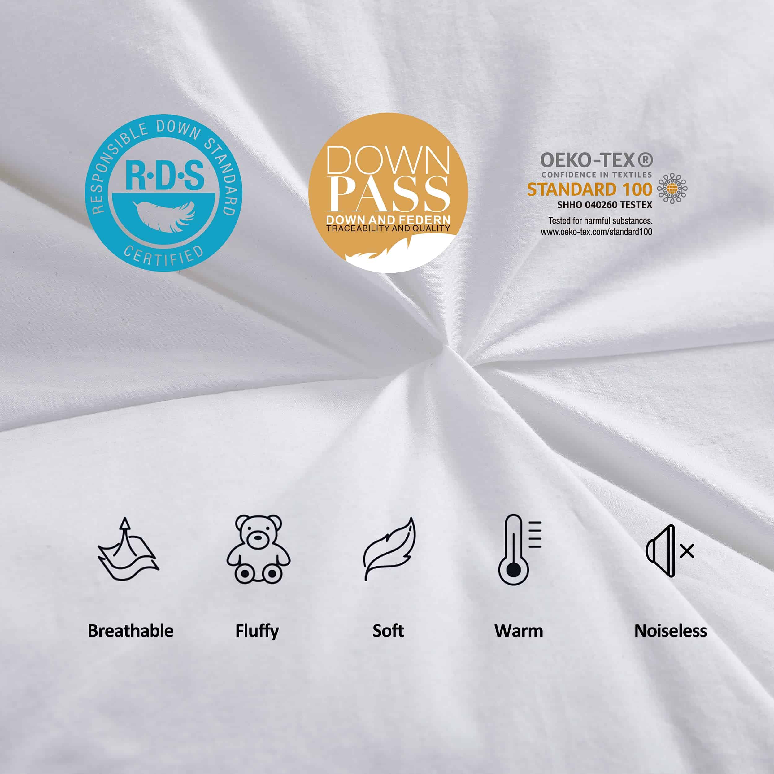 Edredón tamaño Queen de 90 x 90 pulgadas, relleno con 55 oz de peso de llenado, suave como una nube, hecho con fibra de plumas de ganso de fuente responsable (80% fibra de plumas y 20% fibra de plumas de ave acuática), certificado por el Estándar de Plumón Responsable (RDS Certified), Downpass y STANDARD 100 de OEKO-TEX. La lujosa tela de algodón egipcio 100% a prueba de plumón crea una excepcional esponjosidad y te brinda la máxima experiencia de sueño. El edredón ultra suave es el estándar de oro en esponjosidad, asegurando el máximo loft duradero para crear la máxima comodidad. El diseño de construcción de caja de lazo premium y el detalle de pliegue evitan el desplazamiento del plumón y permiten el loft y la calidez máximos. Los bucles y pestañas de esquina cosidos están diseñados para asegurar la funda nórdica en su lugar. Extremadamente suave, transpirable y silencioso. Diseño de doble costura para evitar fugas de plumón. Nuevo en el empaque original de fábrica.