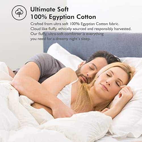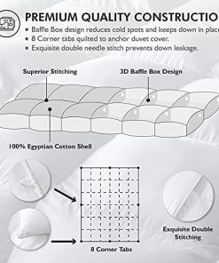 Edredón de tamaño King/California King que mide 106 x 90 pulgadas. La cubierta del edredón está hecha de 100% algodón egipcio para mayor comodidad y para evitar filtraciones. Increíblemente suave, silencioso, transpirable y se siente como dormir en las nubes. El diseño de caja acolchada mantiene el relleno de forma uniforme para obtener el máximo calor y comodidad duradera. Los 8 bucles y pestañas de esquina del edredón están diseñados para sujetar la funda de edredón y protegerlo de desplazamientos. El edredón tiene una mano de obra excepcional para lograr un acabado similar al de la ropa de cama de un hotel de 5 estrellas. Totalmente nuevo y sellado de fábrica y viene en una bolsa tejida con cremallera de alta calidad.