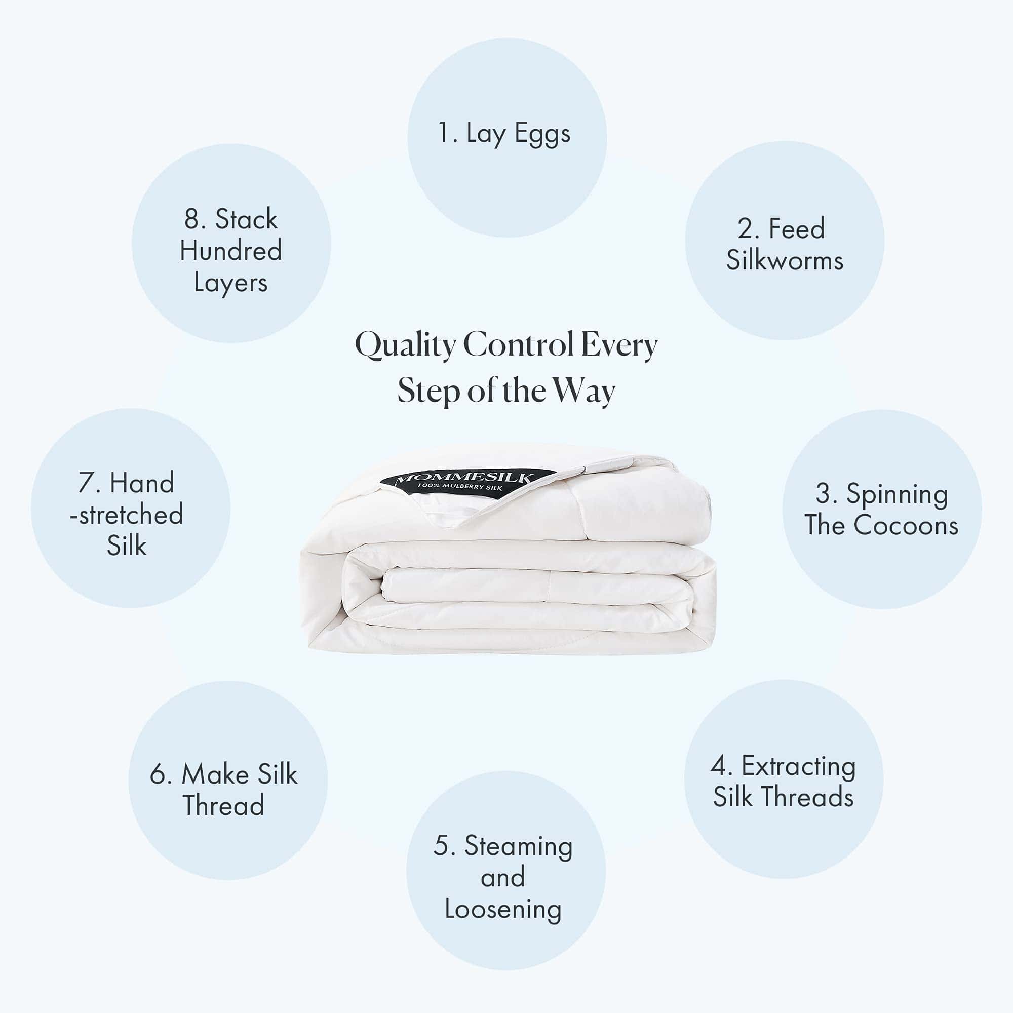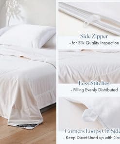 Mommesilk Silk Comforter Summer es un edredón de seda de calidad superior diseñado para todas las estaciones. Su exterior está hecho de 100% algodón premium de 300 hilos en color blanco sólido, mientras que su relleno interno consta de 100% de hilos largos de seda que no se rompen, lo que garantiza una vida útil prolongada. Este edredón de seda ofrece una sensación de lujo y durabilidad a lo largo de los años. Con un tamaño de 280x244cm y un peso de seda de 2.25kg, es perfecto para camas King. Su relleno de seda de hebra larga se mantiene en su lugar gracias a una técnica especial de fijación, distribuyéndose de manera uniforme por todo el edredón. Cuenta con una cremallera corta en un lateral para inspección de autenticidad del relleno de seda de mora, y 8 correas en las esquinas para mantenerlo en su lugar. Ligero y portátil, incluye una bolsa de diseño. Este edredón de seda regula la temperatura corporal, ayudando con afecciones de la piel y evitando la formación de arrugas. Es transpirable, manteniendo el calor en invierno y fresco en verano. Sus propiedades de absorción de humedad mantienen su cama seca y cómoda. Resistente y duradero, con alta resistencia a la tracción, no se encoge y conserva su forma en el tiempo. Es mucho más ligero que un edredón de plumas o algodón, ofreciendo un calor comparable. Su suavidad y comodidad lo hacen ideal para una noche de sueño reparador. Fácil de cuidar, se recomienda airear y lavar a máquina en modo suave. Con una garantía de devolución de 45 días, probar esta manta de seda orgánica es sin riesgos. ¡Disfrute de un sueño acogedor y relajante a partir de esta noche con el edredón de seda refrescante de Mommesilk!