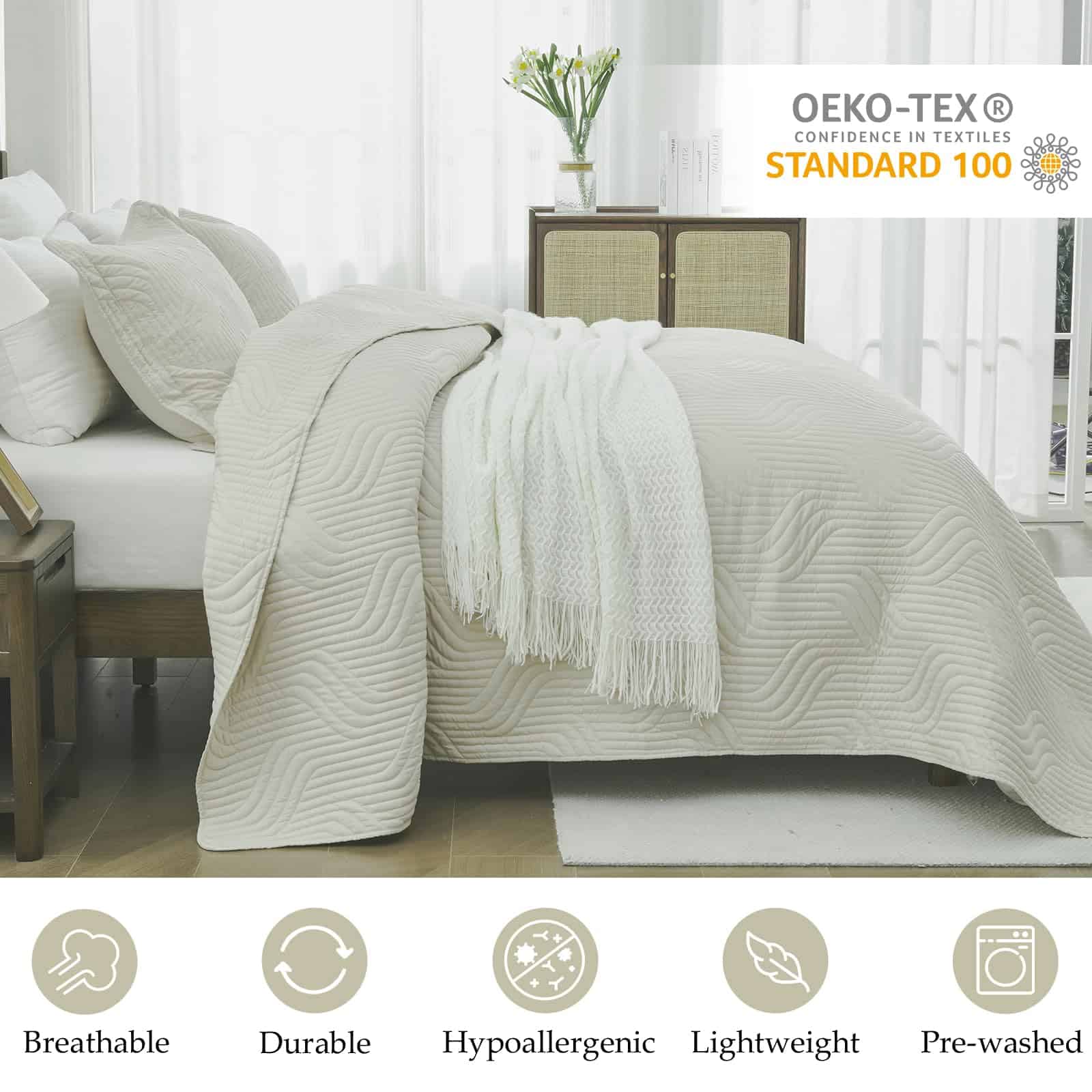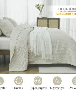 El edredón de tamaño queen CozyStitch está hecho de relleno de poliéster premium y una cubierta de microfibra, ofreciendo durabilidad, suavidad y comodidad. Este juego de edredón incluye 1 edredón queen (90″ x 98″) y 2 fundas de almohada (20″ x 28″), perfecta combinación para tu cama queen. El edredón de color beige claro tiene un diseño sólido con patrón geométrico, creado con tecnología de estampado ultrasónico para textura de líneas clásicas en el juego de edredón. El patrón elegante clásico combina a la perfección con la paleta de colores minimalista, siendo una bonita decoración para tu habitación. Su diseño ligero lo hace portátil y versátil para todas las estaciones, fresco en climas cálidos y abrigado como una manta en primavera y verano, como juego de edredón en otoño e invierno. Fácil de cuidar, lavable a máquina en frío por separado, secar a baja temperatura, no usar lejía ni planchar. Certificado de seguridad: Este juego de edredón cuenta con la certificación OEKO-TEX Standard 100, garantizando la ausencia de sustancias químicas dañinas para los humanos.