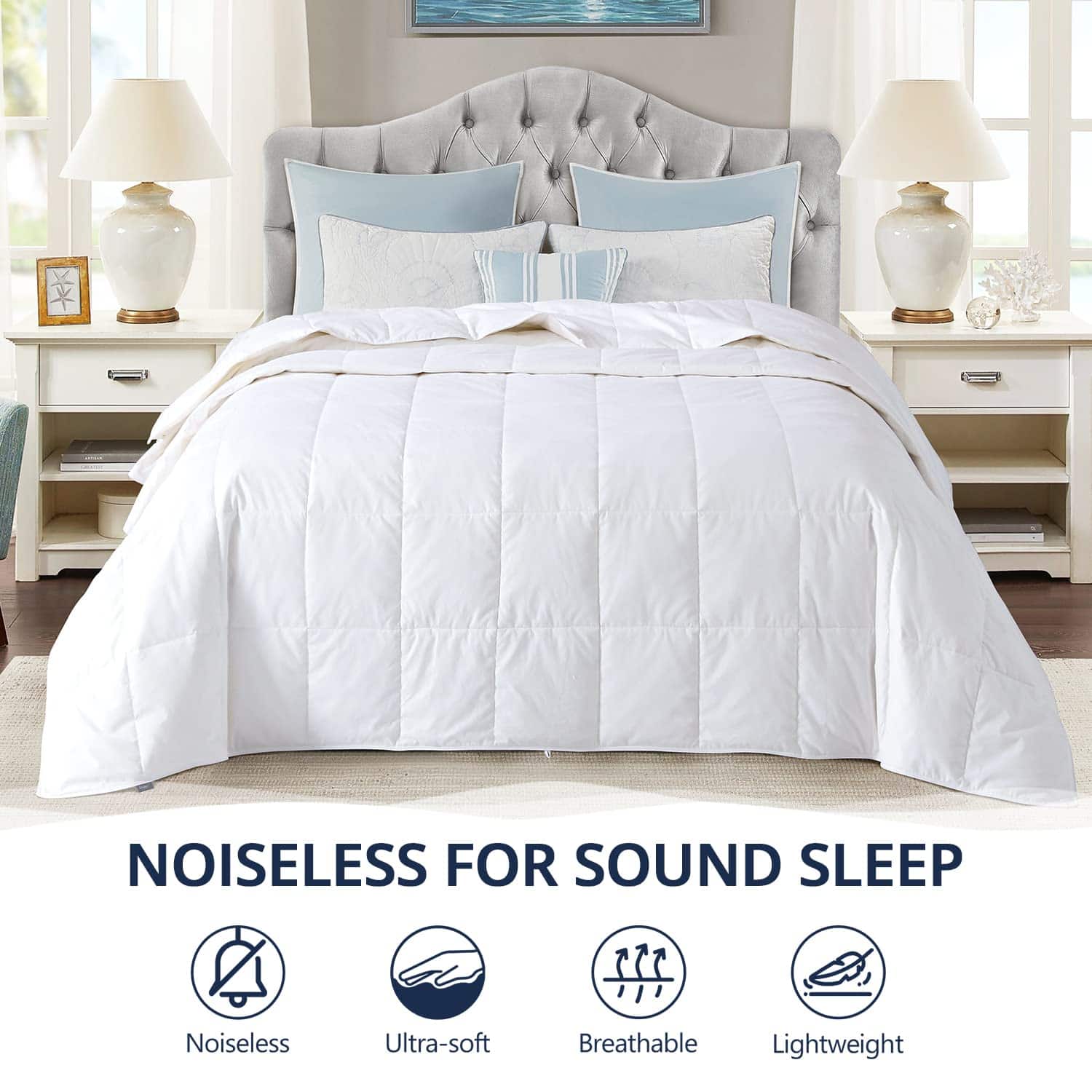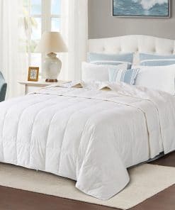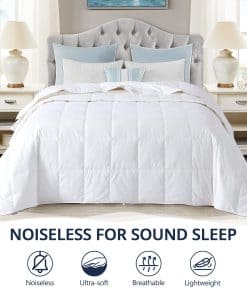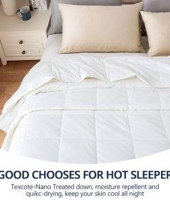 Edredón de plumas extra liviano para verano y personas que sienten calor. Relleno: 75% plumón de pato blanco Texcote-Nano tratado y 25% plumas de pato, repelente de humedad, peso de relleno: 12 OZ. Tela silenciosa al moverse en la cama, súper suave al tacto y evita que el relleno se escape, mejora la calidad del sueño, le permite disfrutar de una noche sin ruidos. Estilo elegante: acolchado en caja y doble costura para evitar que el relleno se desplace y escape. Bonito ribete con cuatro pestañas en las esquinas para sujetar la funda de edredón. Puede usarlo sin una funda de edredón ya que es muy suave al tacto, o puede usarlo con una funda de edredón para mantenerlo limpio y evitar lavados frecuentes. Certificado de seguridad: certificado OEKO-TEX STANDARD 100. Auditado por DOWNPASS, garantizamos que no se realiza arrancado de plumas vivas, cría en jaula ni alimentación forzada, todas las plumas y plumones provienen de la industria alimentaria.