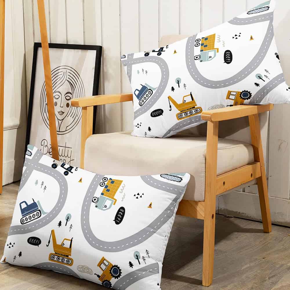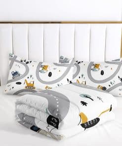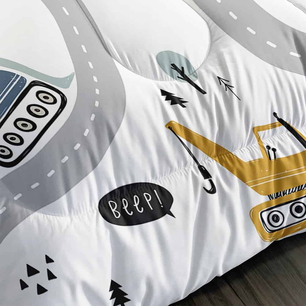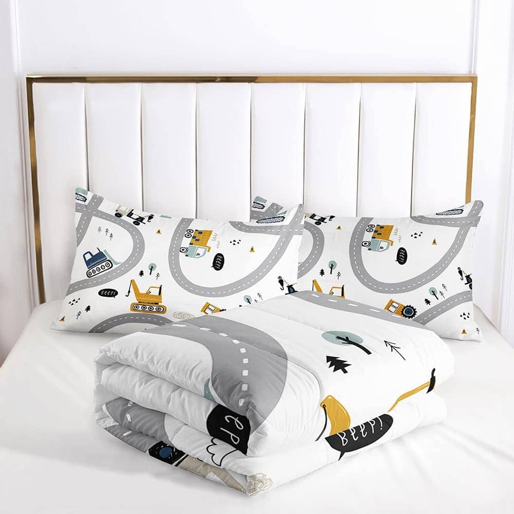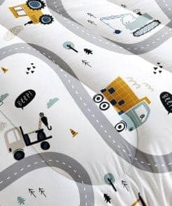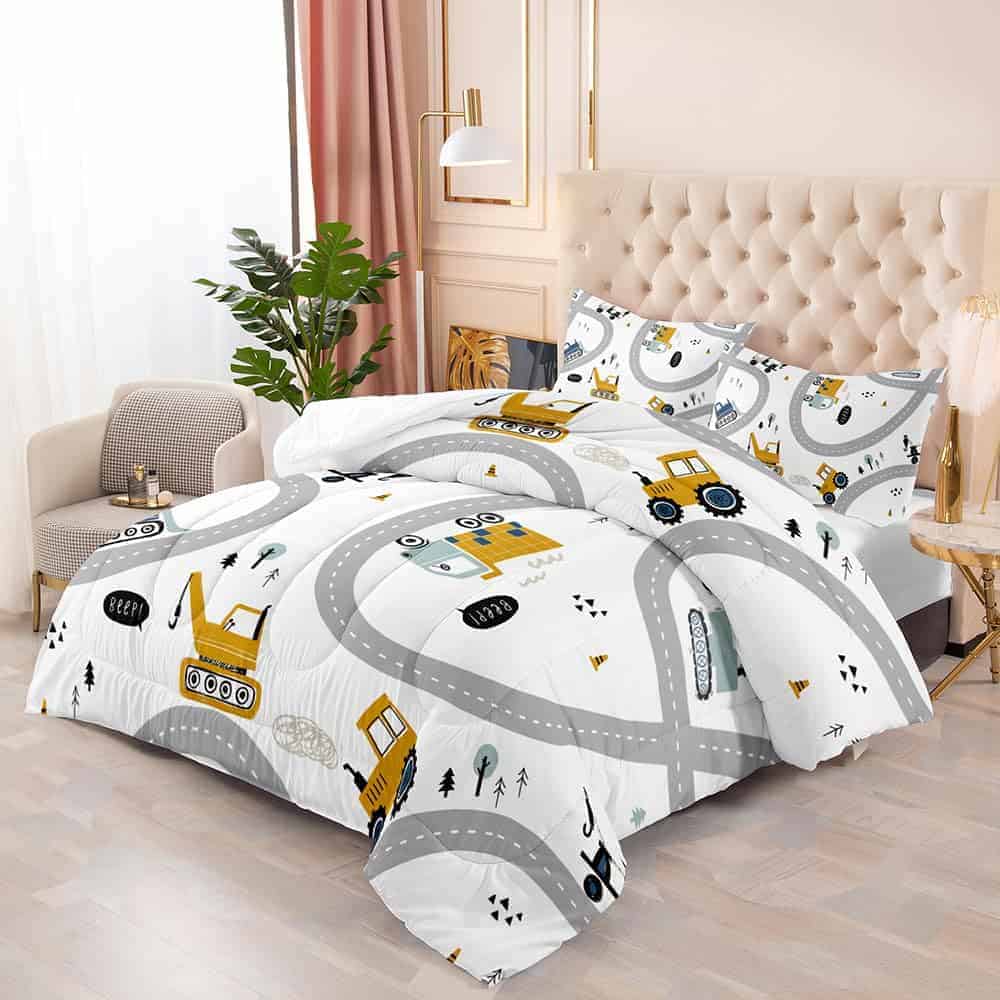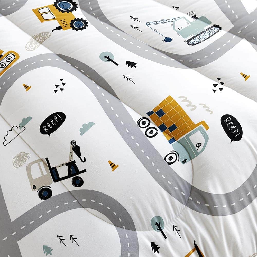 El juego de confort impreso de vehículos de construcción satisface todo tipo de decoración de dormitorio incluyendo antiguo, vintage, moderno o estilo chic, etc.