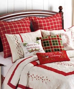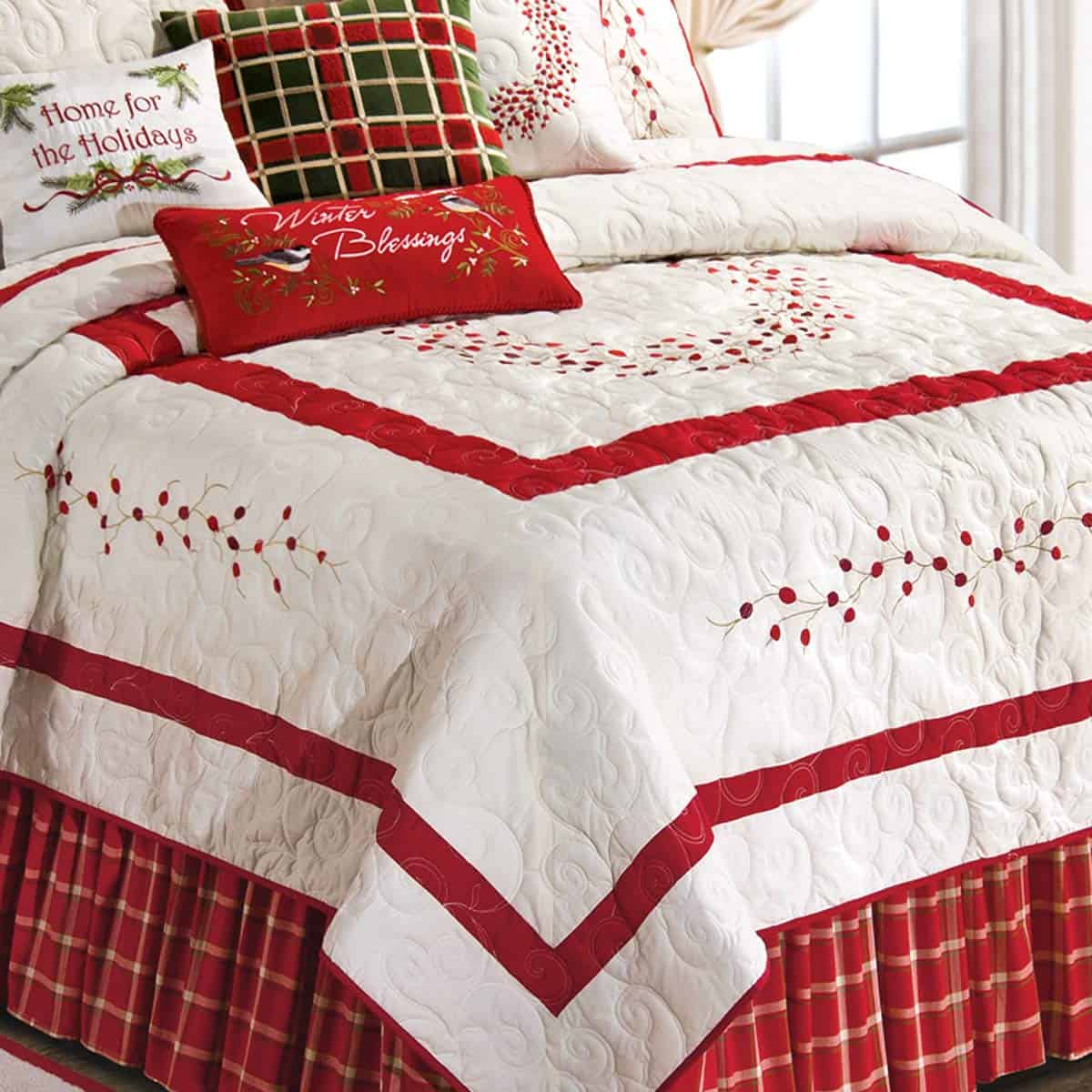La simplicidad hace una declaración con la colección de ropa de cama Berry Wreath. Las bayas rojas bordadas forman una corona céntrica en una base blanca simple. Recortado con un borde carmesí y acentuado por guirnaldas de bayas bordadas en los cuatro lados, el acolchado en espiral proporciona textura y un atractivo visual adicional a lo que seguramente se convertirá en su nuevo edredón favorito. Diseñado pensando en las vacaciones, pero lo suficientemente versátil para el uso diario, este edredón de algodón suave y extragrande es lavable a máquina para un cuidado fácil. Las fundas de almohada y accesorios se venden por separado.