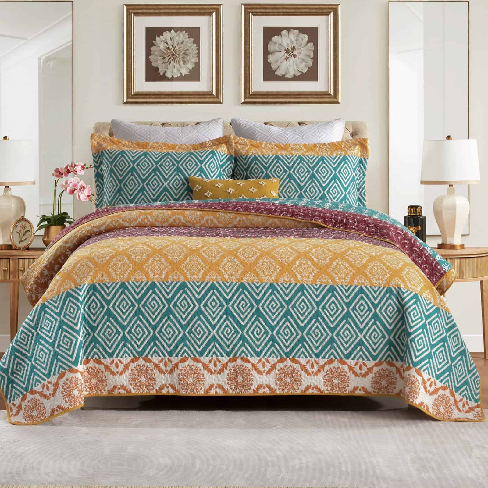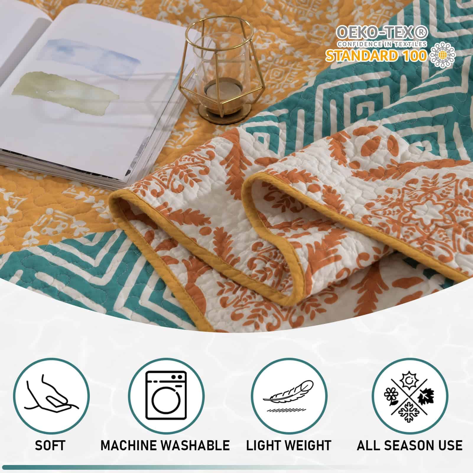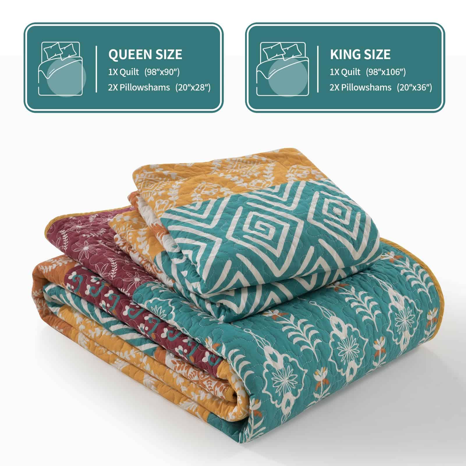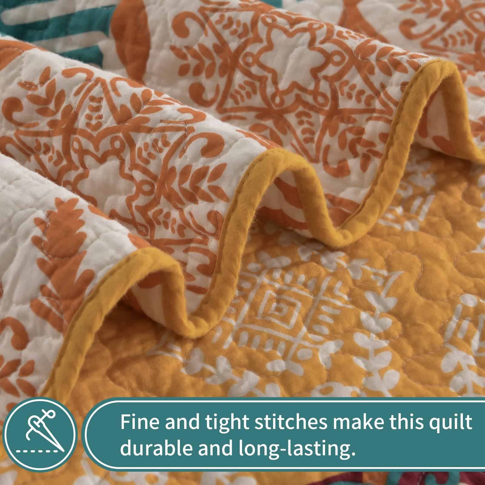 1. Con su transpirabilidad natural y propiedades hipoalergénicas, este edredón king 100% algodón es una excelente opción para aquellos que buscan una experiencia de sueño cómoda y saludable. 2. Este edredón king de estilo bohemio utiliza colores amarillo, naranja y verde, que son audaces y brillantes, llenos de estilo tropical exótico. Los patrones florales coloridos y étnicos hacen que este edredón sea popular entre la gente. La artesanía de costura doble hace que este cubrecamas king sea duradero. 3. Este juego de edredón cubrecamas puede utilizarse en todas las estaciones. Especialmente en el verano caliente, la buena transpirabilidad y ligereza de este edredón evitan los sudores nocturnos y la incomodidad causada por la sofocación, asegurando una experiencia de sueño cómoda para ti. 4. Nuestro set de edredón king incluye: 1 Edredón (98 x 106 pulgadas) + 2 Fundas de Almohada (20 x 36 pulgadas). 5. Simplemente lavar a máquina este set de edredón por separado en agua fría. Secar al aire o secar en secadora a baja temperatura. Por favor, ten en cuenta que no se recomienda usar blanqueador en este set de ropa de cama. Sigue estas simples instrucciones para asegurarte de que tu set de edredón se mantenga fresco y hermoso durante años. 6. Nuestros juegos de ropa de cama han pasado la certificación OEKO-TEX Standard 100, asegurando que los productos estén libres de sustancias nocivas, permitiéndote usarlos con tranquilidad. 7. Si tienes alguna pregunta sobre nuestros sets de edredón, no dudes en contactarnos. Responderemos tus consultas lo antes posible y te ofreceremos un servicio de alta calidad.